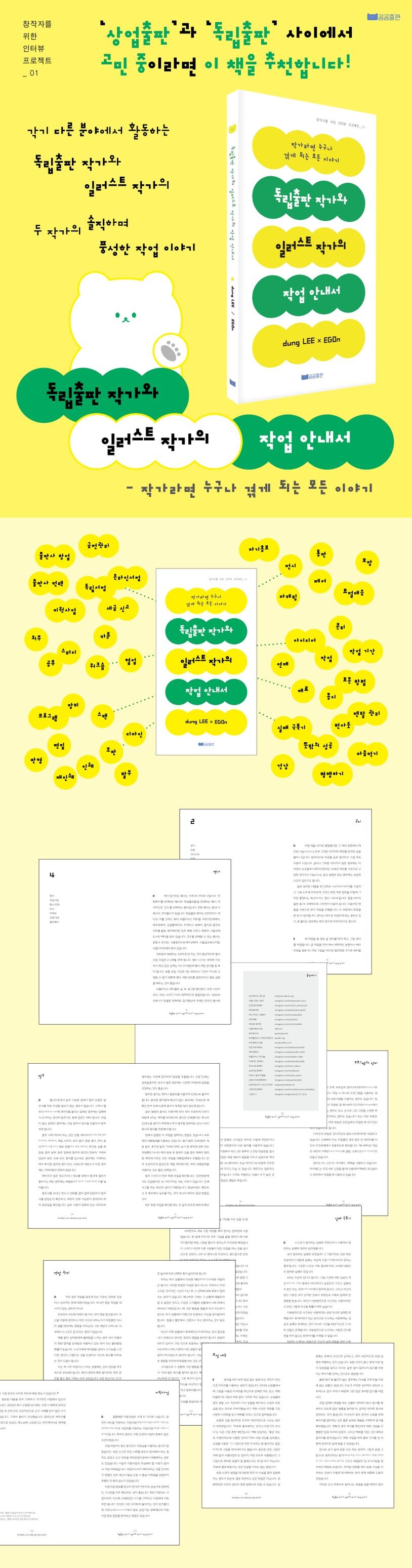 ‘상업출판’과 ‘독립출판’ 사이에서 고민 중이라면 도움이 될 책입니다!디자인 회사와 출판사를 거쳐 1인 그래픽 스튜디오와 1인 출판사를 운영하는 dung LEE와 취미로 그리던 그림이 직업이 된 일러스트 작가 EGOn. 각기 방향성이 다른 두 작가가 창작의 모든 과정에 대해 솔직하게 적었다. 콘티부터 디자인까지 창작의 전 과정뿐만 아니라 외주, 전시, 행사, 워크숍 등 작가로서 겪었던 다양한 경험, 그리고 멘탈 관리와 SNS 홍보, 금전 관리 등 프리랜서로 활동하면서 얻은 작업 노하우를 소개한다.