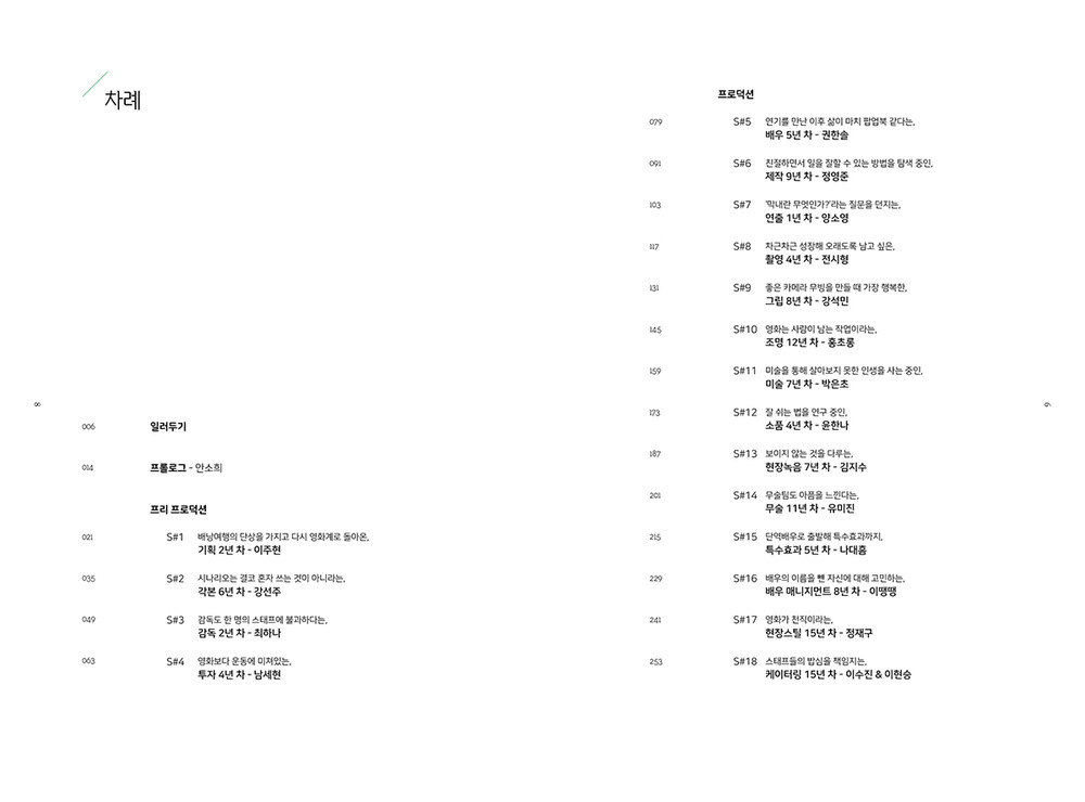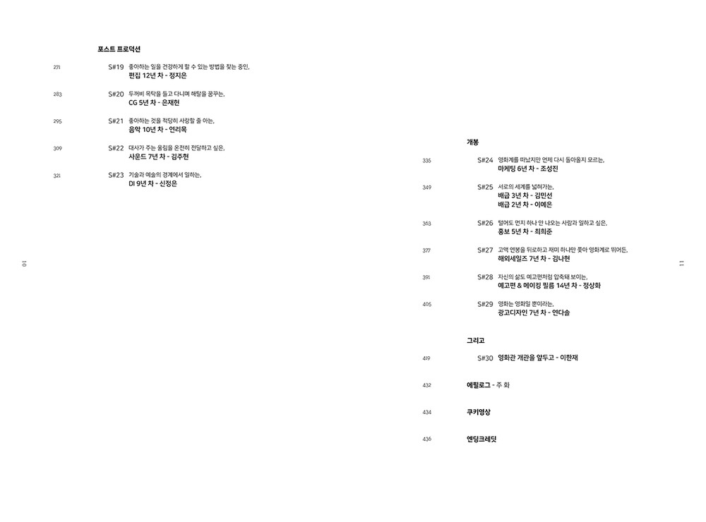 한 영화에는 작품을 대표하는 사람들 외에도 보이지 않는 곳에서 묵묵히 자신의 일을 해내는엔딩크레딧 속 사람들이 있다. 한국영화계에서 종사했던 인터뷰어/지은이 두 명은 자신들의 동료들을인터뷰하며 이들의 이야기를 담아냈다.