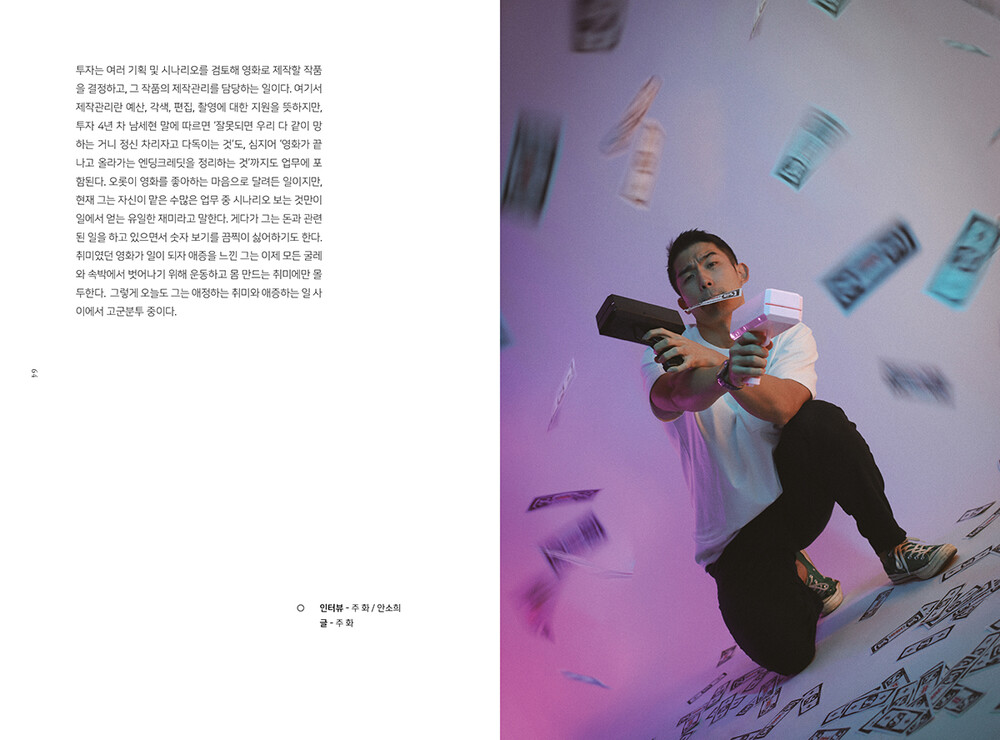 5년간 한국영화 투자팀에서 일하며 내 취향의 영화와 남들이 좋아하는 영화 사이에서 고통스럽고도 즐거운 시간을 보냈다. 퇴사 후 백수(白手: 돈 한푼 없이 빈둥거리고 놀고먹는 건달)가 아닌 백수(白水: 깨끗하고 맑은 마음)로 살며 내 자신이 아닌 내 주변 동료들의 이야기가 눈에 들어오기 시작했다. 그리고 그들의 이야기를 커피 한잔과 함께 흘려보내는 대신 이 책으로 붙잡아보고 싶었다.