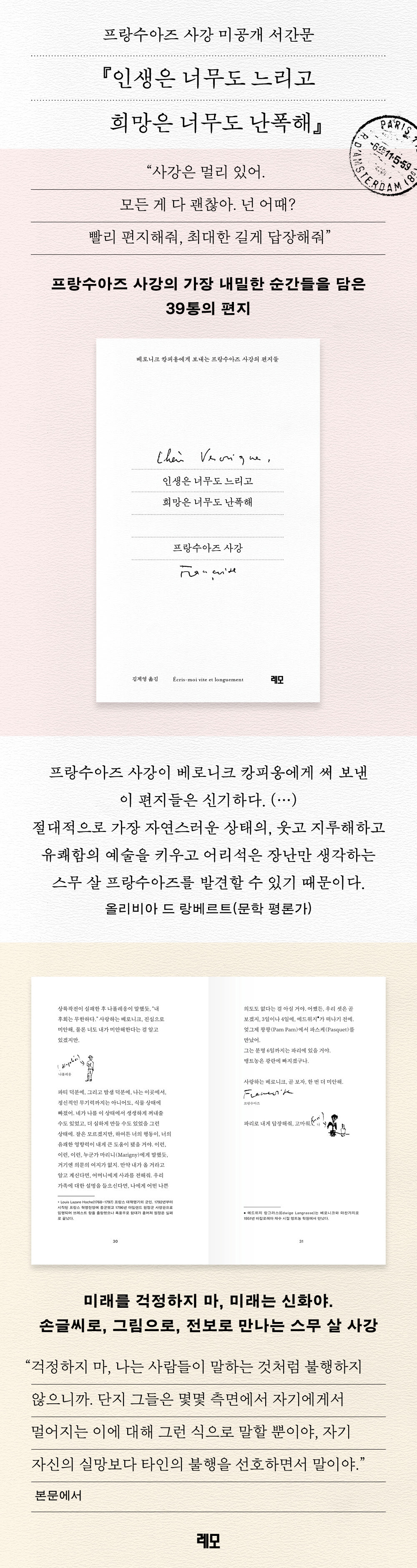 ‘프랑스 문학의 앙팡 테리블’, ‘프랑스 최고의 감각’, ‘금기를 깨는 아이콘’, ‘자유분방한 영혼’… 프랑수아즈 사강처럼 작품만큼이나 일거수일투족이 화제에 오른 작가도 없었을 것이다. 그러나 우리는 프랑수아즈 사강을 얼마나 알고 있을까. 『인생은 너무도 느리고 희망은 너무도 난폭해』는 『슬픔이여 안녕』으로 일약 세계적인 스타가 된 사강이 가장 친한 친구 베로니크 캉피옹에게 보낸 편지를 담은 서간집이다. 너무 이른 나이에 세계적인 성공을 거두고, 각국을 여행하며 영화를 찍고, 이른바 돈방석에 앉은 사강이 틈날 때마다 한 일은 ‘편지 쓰기’였다. 우정을 지키기 위해, 자기 자신을 잃지 않기 위해 분투하는 사강의 가장 내밀한 고백들이 『인생은 너무도 느리고 희망은 너무도 난폭해』에 고스란히 담겼다. 프랑수아즈였던 사강과 사강이 된 프랑수아즈(‘사강’은 데뷔하며 지은 필명으로, 본명은 ‘프랑수아즈 쿠아레’이다)를 동시에 만날 수 있는 값진 기회가 될 것이다.