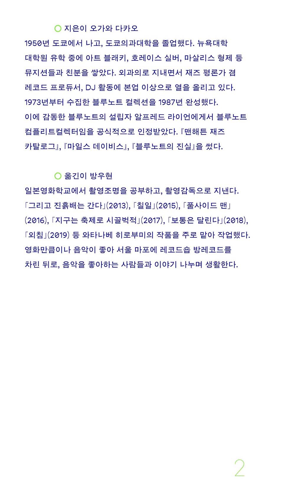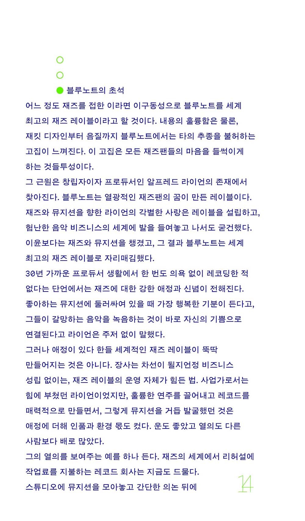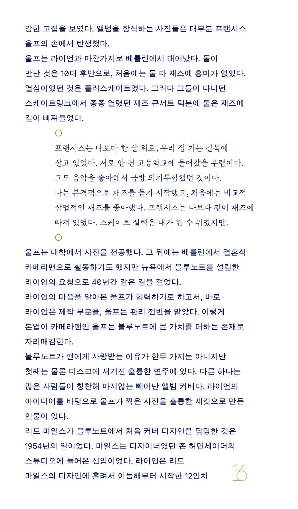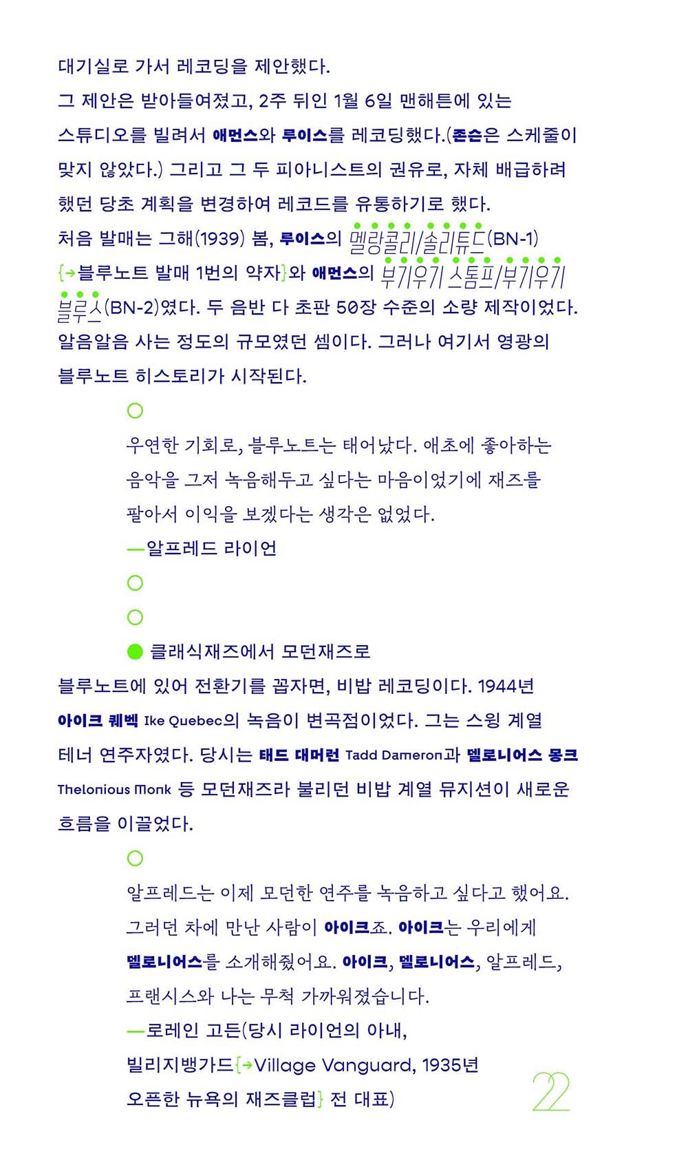 Vol.1이었다면 내 시작은 카인드 오브 블루다. 카인드 오브블루에 이르기까지 징검다리가 있긴 했다. 음반 매장에서 틀어 놓은 조지 벤슨의 「디스 매스커레이드」를 듣고 ‘분위기 참 묘하네.’ 하며 기억해두었는데 얼마 후 키스 자렛의 「마이 송」을 접하고 재즈에 마음을 활짝 열게 되었다. 주변에 안내자가 없어 무작정 음반 매장의 재즈 코너를 뒤적이다 카인드 오브 블루를 발견했다. 푸르고 뿌연 사진이 인상적이었고 마일스 데이비스라는 이름도 어딘가에서 들어 본 듯했다. 무엇보다 Kind Of Blue라는 단어가 멋있었다. 이렇게 우스운 경로로 전설을 마주하게 되기도 한다. 앞서 언급한 어떤 곡도 블루노트는 아니지만 모두 재즈라는 바다에 속한 거대한 생태계의 일원이다. 『블루노트 컬렉터를 위한 지침』의 디자인 의뢰를 받고 무척 기뻤다. 처음 떠올린 생각은 책 전체에 한 가지 크기의 글자만 쓰는 것이었다. 조판을 마치고 보니 마치 단선율의 그레고리오성가 음반 컬렉터를 위한 책처럼 보였다. 무에서 차곡차곡 넓혀간 저자의 좌충우돌 컬렉팅 대모험에 어울리지 않는 아이디어였다.