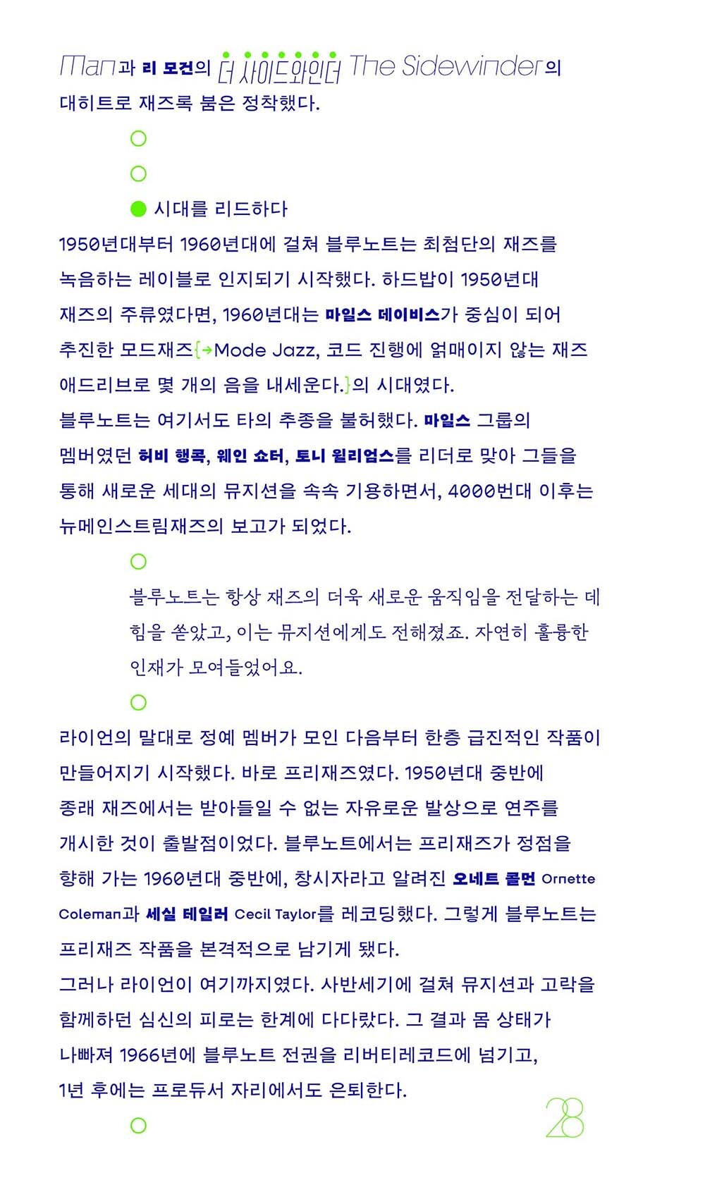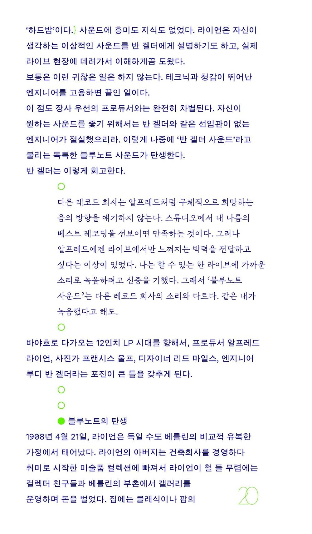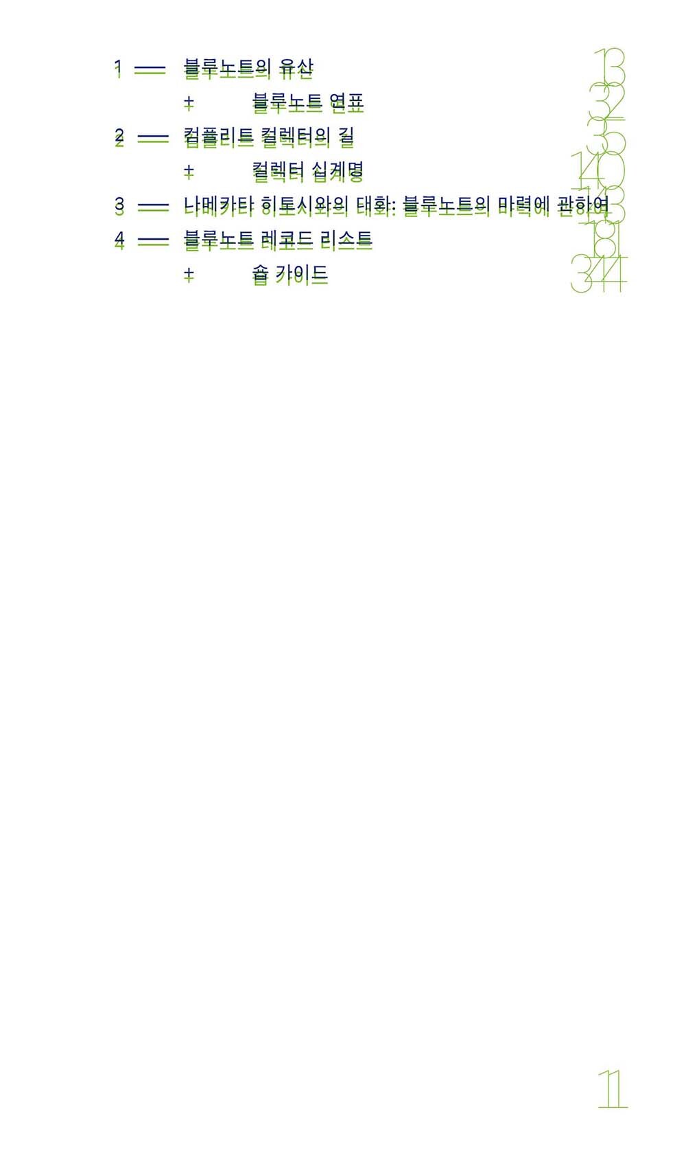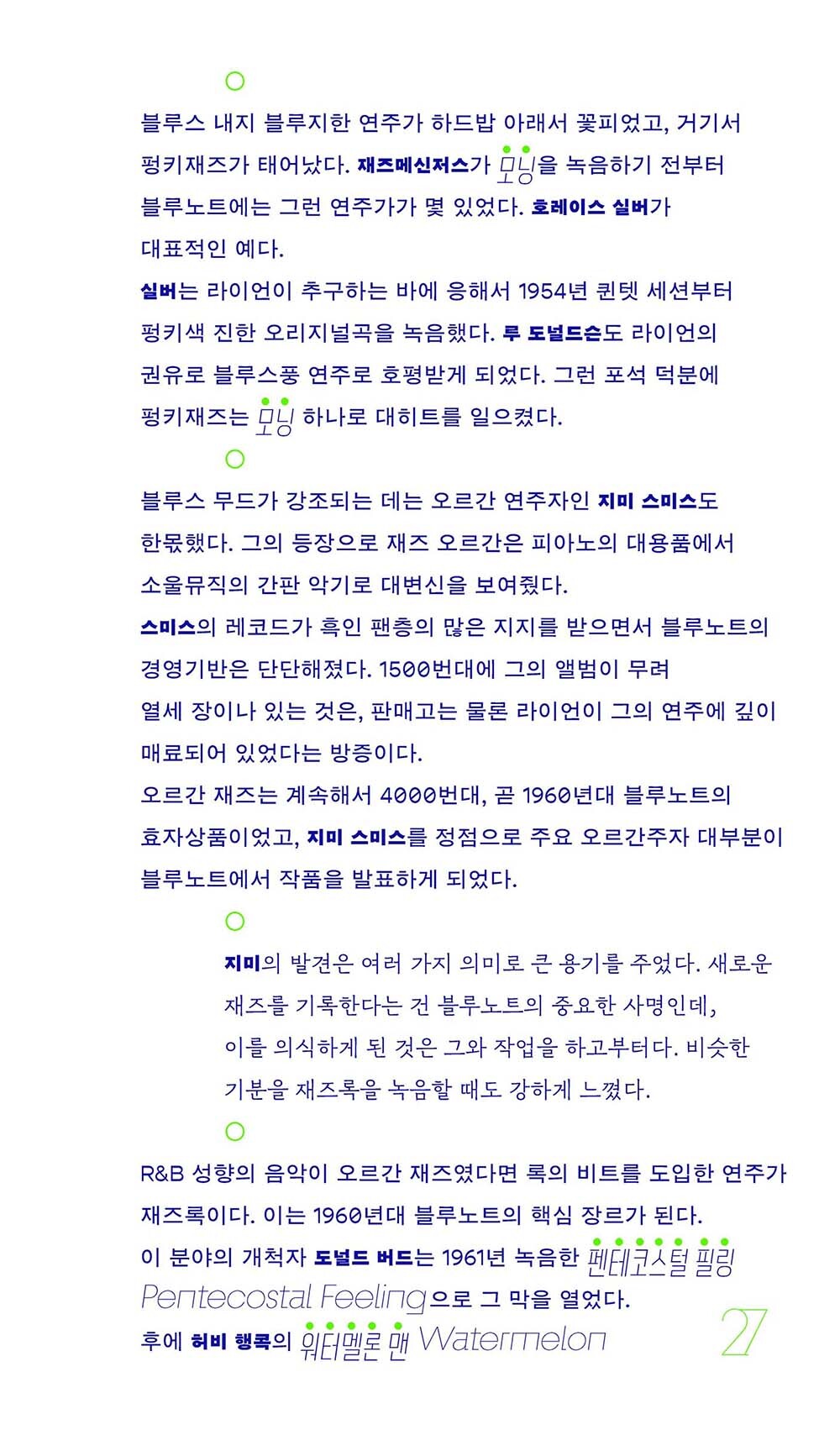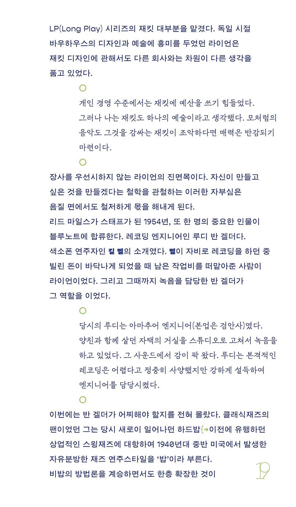 Vol.1이었다면 내 시작은 카인드 오브 블루다. 카인드 오브블루에 이르기까지 징검다리가 있긴 했다. 음반 매장에서 틀어 놓은 조지 벤슨의 「디스 매스커레이드」를 듣고 ‘분위기 참 묘하네.’ 하며 기억해두었는데 얼마 후 키스 자렛의 「마이 송」을 접하고 재즈에 마음을 활짝 열게 되었다. 주변에 안내자가 없어 무작정 음반 매장의 재즈 코너를 뒤적이다 카인드 오브 블루를 발견했다. 푸르고 뿌연 사진이 인상적이었고 마일스 데이비스라는 이름도 어딘가에서 들어 본 듯했다. 무엇보다 Kind Of Blue라는 단어가 멋있었다. 이렇게 우스운 경로로 전설을 마주하게 되기도 한다. 앞서 언급한 어떤 곡도 블루노트는 아니지만 모두 재즈라는 바다에 속한 거대한 생태계의 일원이다. 『블루노트 컬렉터를 위한 지침』의 디자인 의뢰를 받고 무척 기뻤다. 처음 떠올린 생각은 책 전체에 한 가지 크기의 글자만 쓰는 것이었다. 조판을 마치고 보니 마치 단선율의 그레고리오성가 음반 컬렉터를 위한 책처럼 보였다. 무에서 차곡차곡 넓혀간 저자의 좌충우돌 컬렉팅 대모험에 어울리지 않는 아이디어였다.
