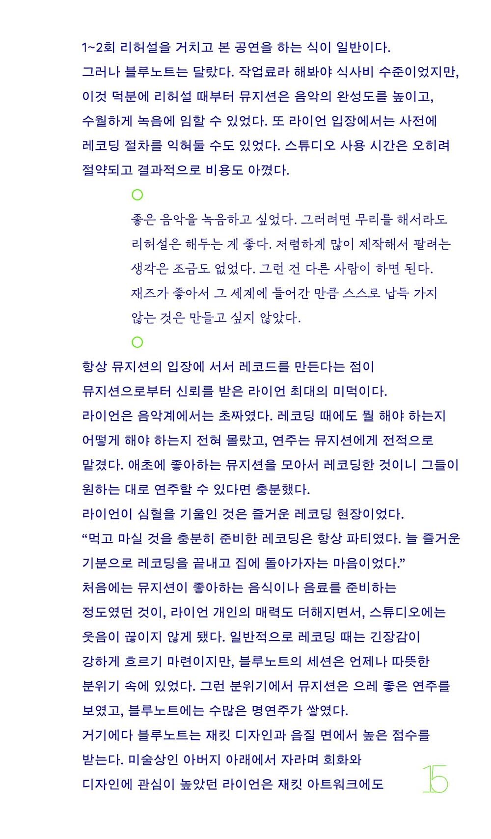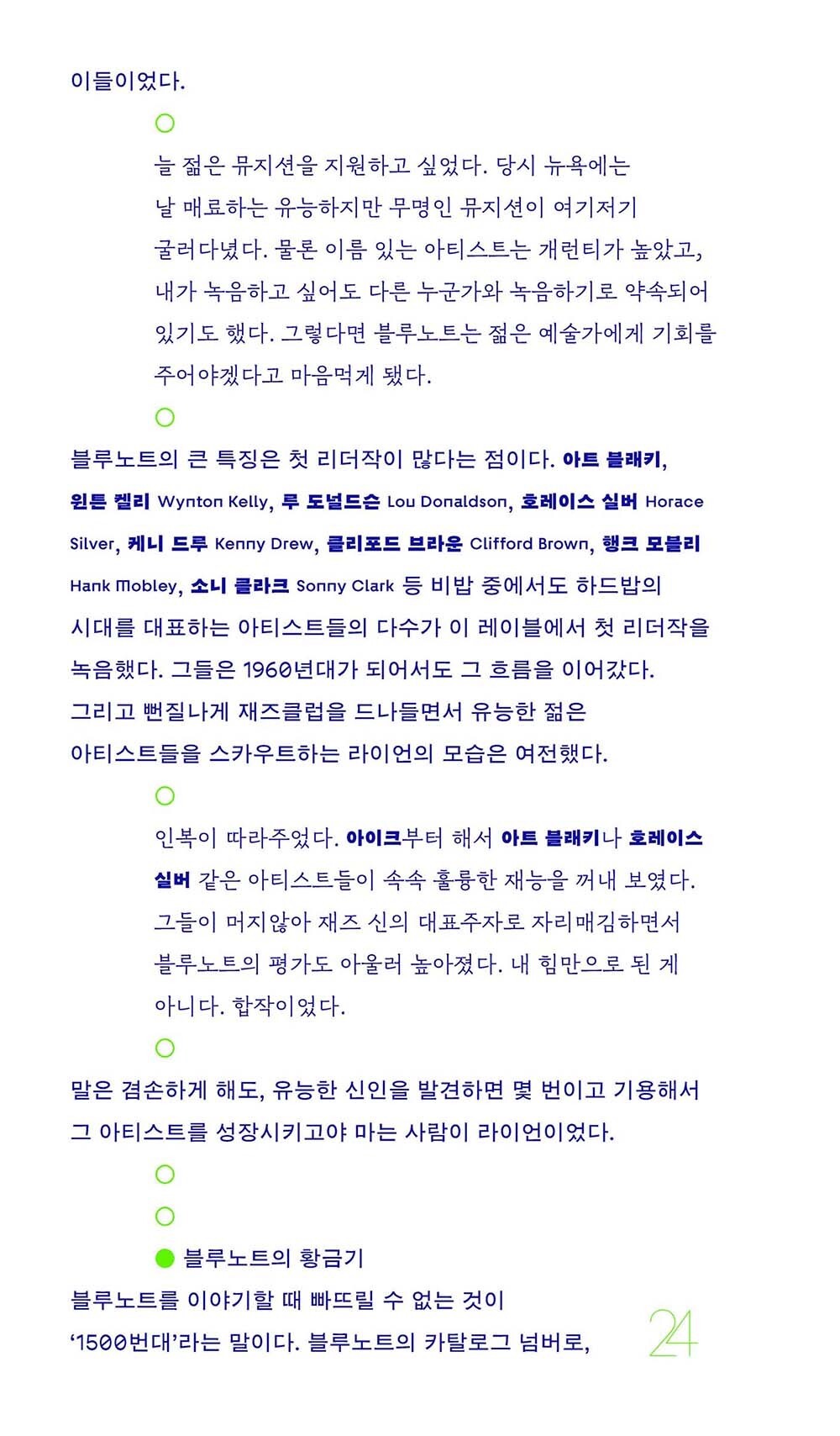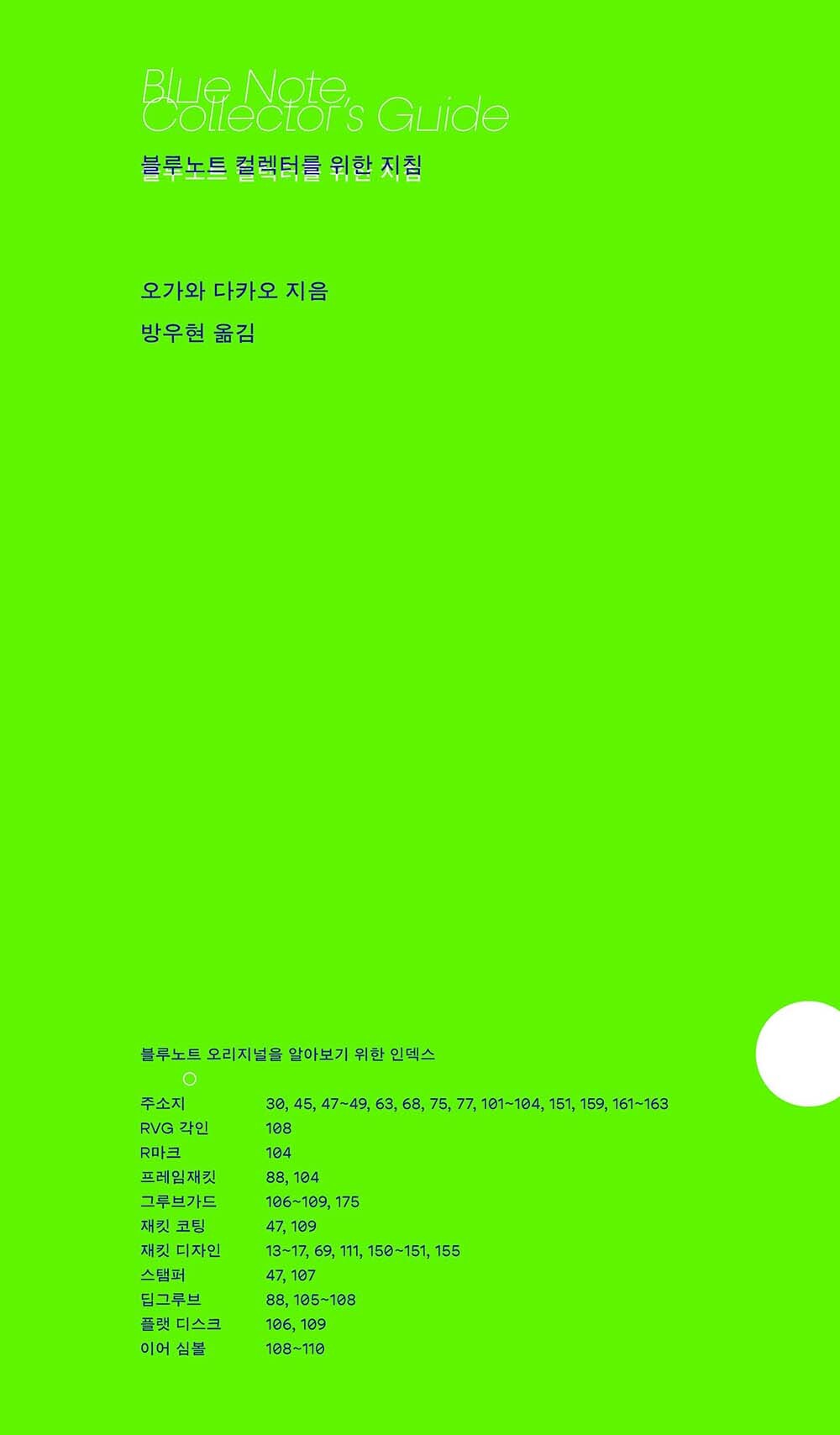 『블루노트 컬렉터를 위한 지침』 한국어판 역시 컬렉션의 대상이 되도록 만듦새에 심혈을 기울였다. 직접 음반을 수집하고 사입하고 판매하는 레코드숍 운영자의 번역은 미끈하기보다는 겸손하고도 친절하며, 본문은 재즈처럼 흘러가도록 여러 서체를 쓰되 어우러지게, 무엇보다 뮤지션과 음반 타이틀이 한눈에 들어오도록 디자인했다. 컬렉션은 어느 정도까지 자신의 의지로 되지만, ‘완성’을 위해서는 ‘우정’이 요구된다. 이 책 역시 마찬가지. 출판사 나름의 노력과 의지로 선보이는 이 책이 ‘완성’되는 것은, 독자인 당신이 읽어주셨을 때다.