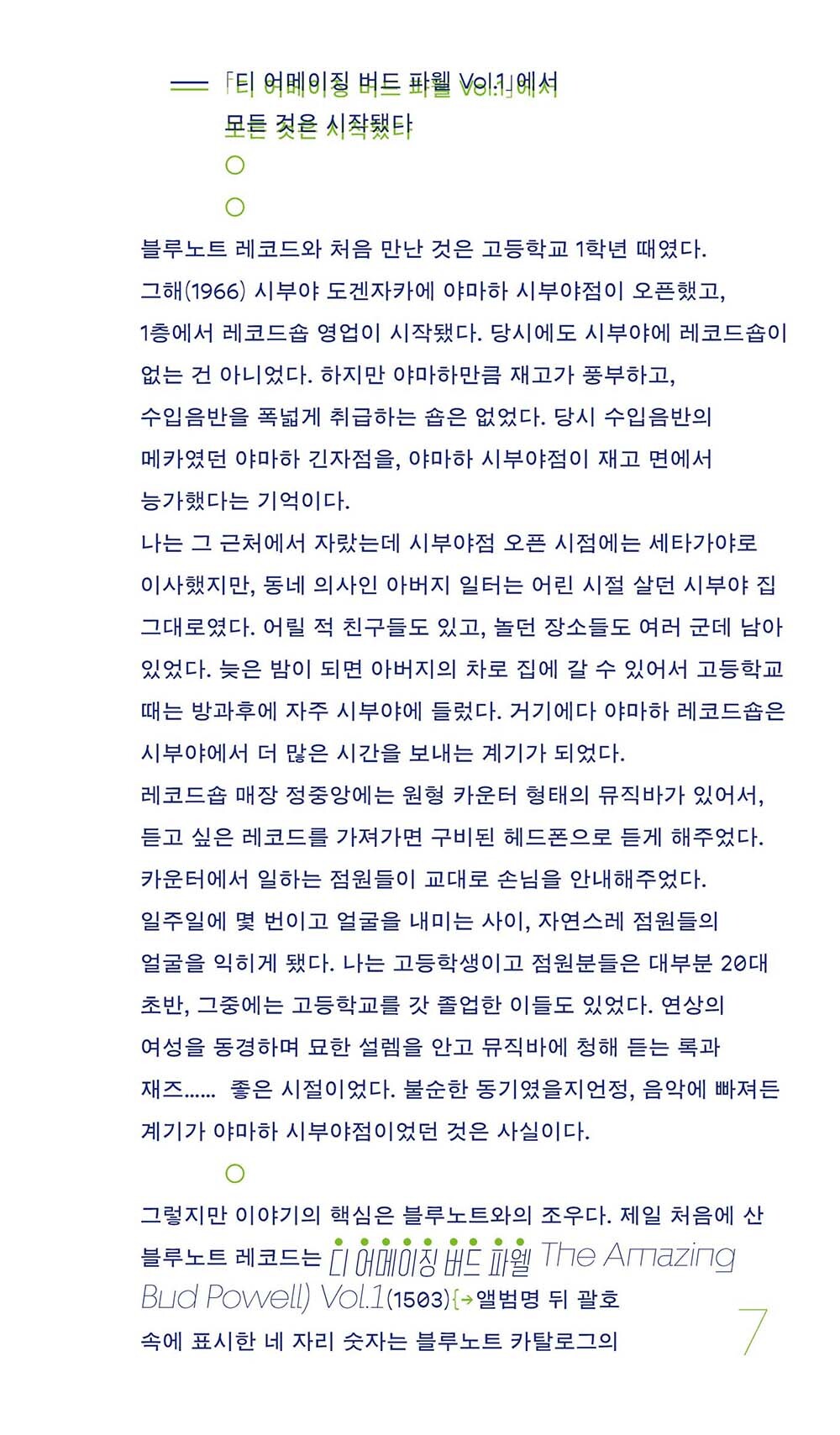 “어느 날엔가 들렀던 재즈 매장에서 눈에 띄는 재킷이 있었다. 녹색 배경에 희미하게 실루엣 처리된, 배를 탄 사람이 그려진 음반이었다. 그건 허비 행콕의 <메이든 보야지(Maiden Voyage)>였다. 재즈 음악은 잘 몰랐지만 재킷이 멋있어서 샀다. 가격도 1000엔 이하로, 저렴했다. 나중에 알고 보니 블루노트라는 레이블 음악이었는데, 도시바 EMI라고도 적혀 있었다. 일본 라이선스 음반이었던 거다. 아무렴 어떤가. 내 방에 돌아와 턴테이블에 올렸을 때는 재킷 이미지와 어울리는 음악이 흘러나왔다. 오디오 시스템이 보잘것없어서 소리가 좋다거나 그런 것은 몰랐다. 그냥 음악이 좋을 뿐이었다. 허비 행콕으로, 처음 블루노트를 접하게 된 것이다. 블루노트 레코드가 좋다는 말은 여기저기서 많이 들었지만 나한테는 아직 비싼 음반이었다.
