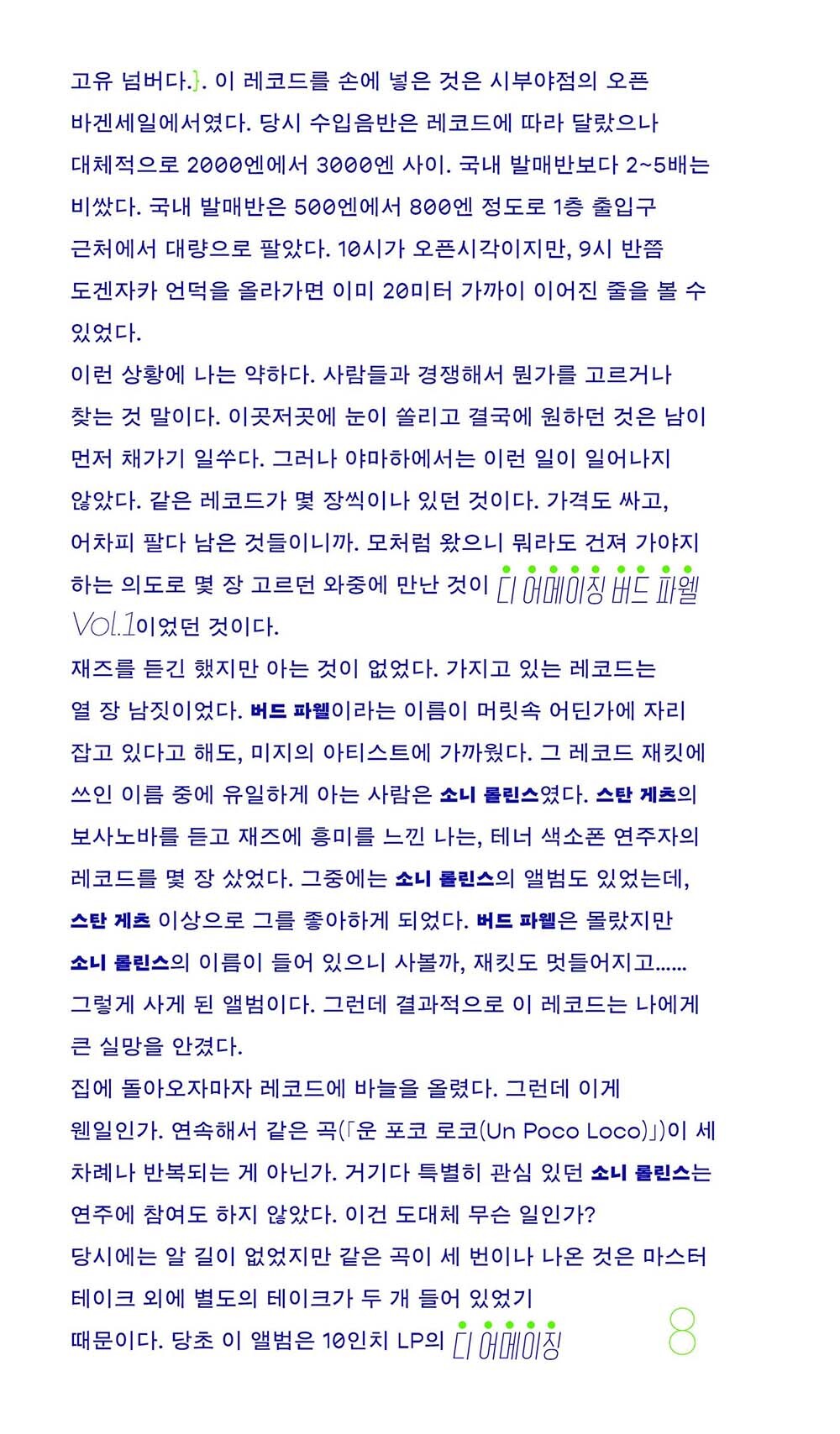 이번엔 다른 이들이 오가와를 찾는다. 오리지널을 가려달라고, 재킷을 빌려달라고, 글을 써달라고, 숍 가이드를 해달라고…… 이번엔 재즈가 그를 찾아왔다. 그가 찾은 것이 그를 찾았다는 이야기…… 드문 일은 아니지만, 나 역시 생의 어떤 국면에 접어들 때면 이 이야기를 찾게 될 것 같다. 이 이야기가 나를 찾았듯이.