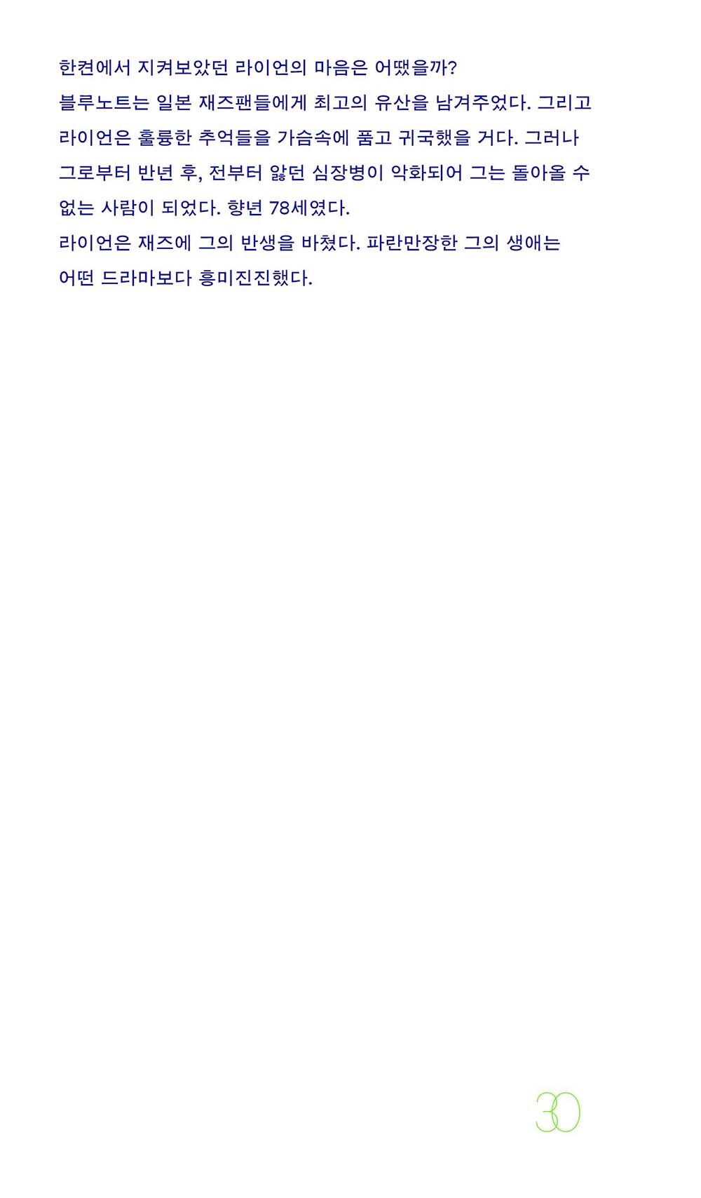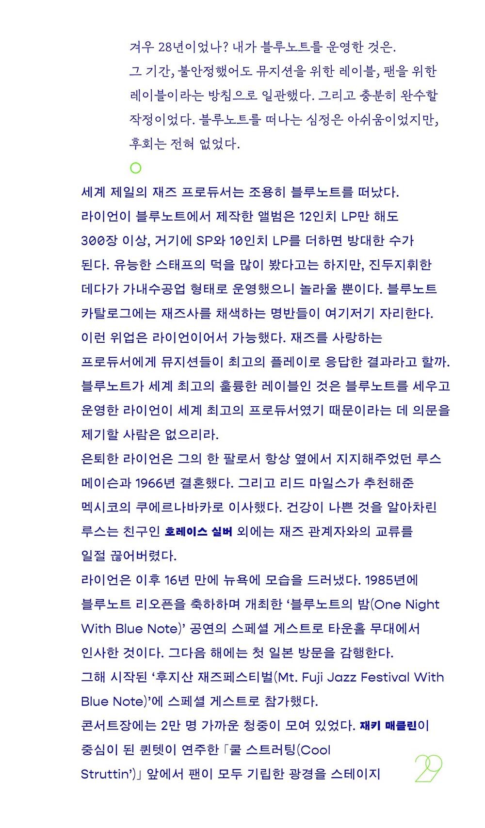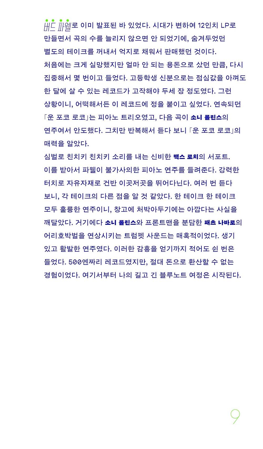 일본의 중고반 매장 도서 코너에서 우연히 발견한 이 책 는 블루노트 컴플리트컬렉터가 썼다는 문구만 보고 당장 구매했었다. 기대대로 딱딱하고 설명적인 전문서가 아니고 저자 본인의 컬렉터 인생이 담겨 있었다. 재즈 음악에 대해 관심을 갖게 되고, 블루노트를 알게 되고, 결국 완벽한 컬렉션을 갖추기까지 삶의 여정이. 캐주얼한 문장과 크고 작은 에피소드를 읽다 보면 입가에 미소가 지어진다. 그리고 그 미소 너머로, 컬렉션의 묘미와 음반 정보를 습득했다. 재즈 관련 서적을 드물게 만나게 되는 한국에 언젠가는 꼭 소개해보고 싶단 마음이 생겼다.”