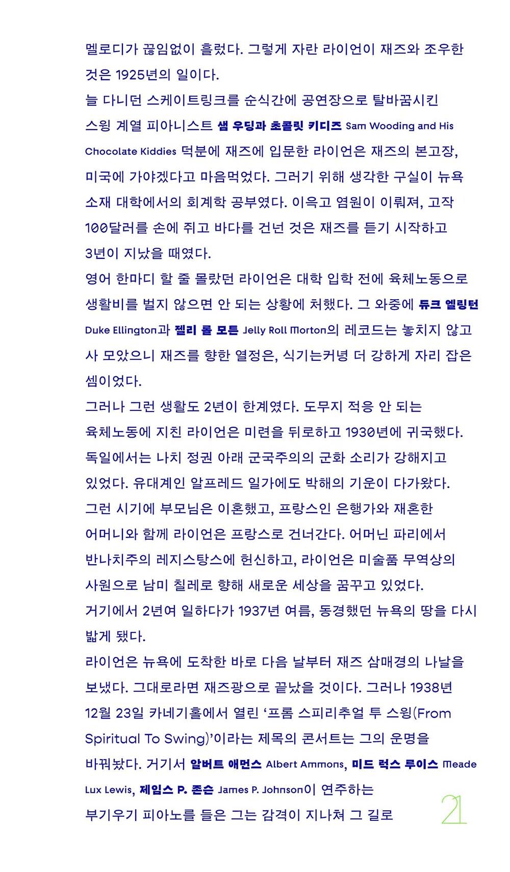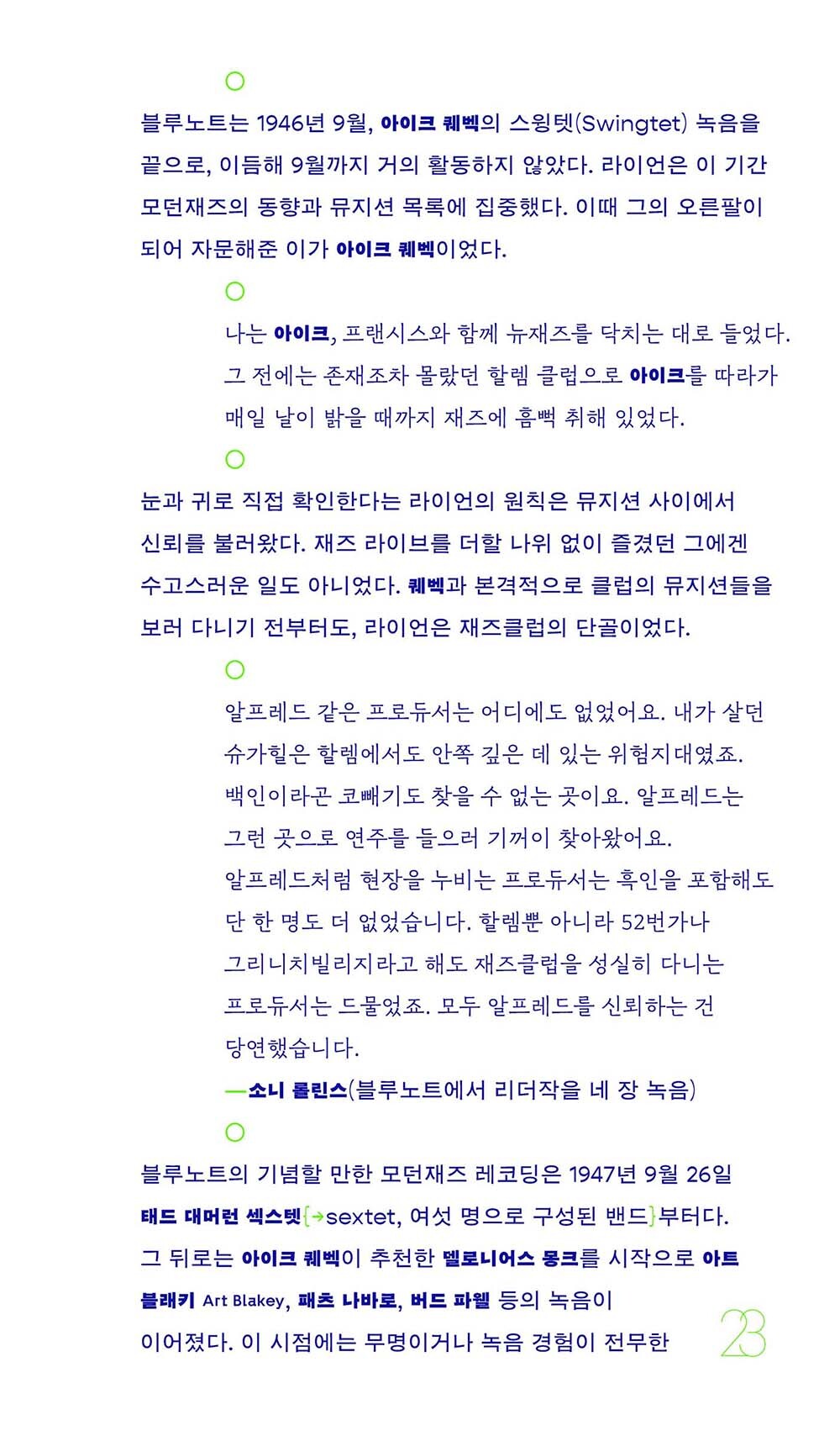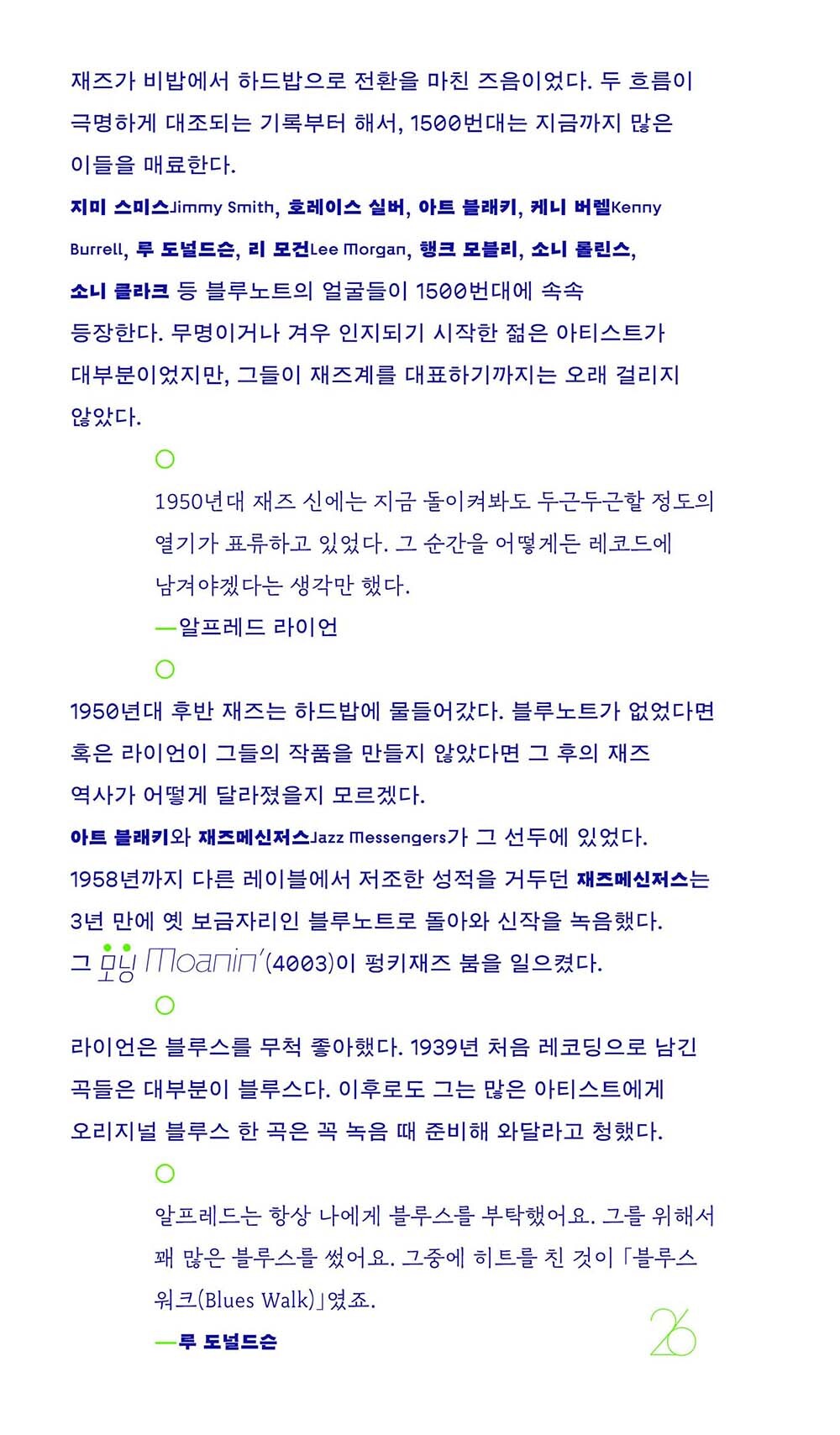 지면에 재즈가 흐르게 해야 했다. 책의 큰 분량을 차지하는 레코드 리스트는 앨범 표지, 아티스트명, 앨범명 등 동일한 위계의 정보가 반복 등장해 자칫하면 지루해지기 쉬웠다. 겹낫표 등의 부호 대신 다양한 크기, 굵기, 자간, 기울기, 기준선 등을 글자에 적용해 다양한 ‘사운드’를 만들어 책 전체에 두루 적용했다. 한글 앨범명에는 권점을 찍어 비트를 만들었다. 변칙을 흔쾌히 받아준 쪽프레스가 이 책의 알프레드 라이언이다.