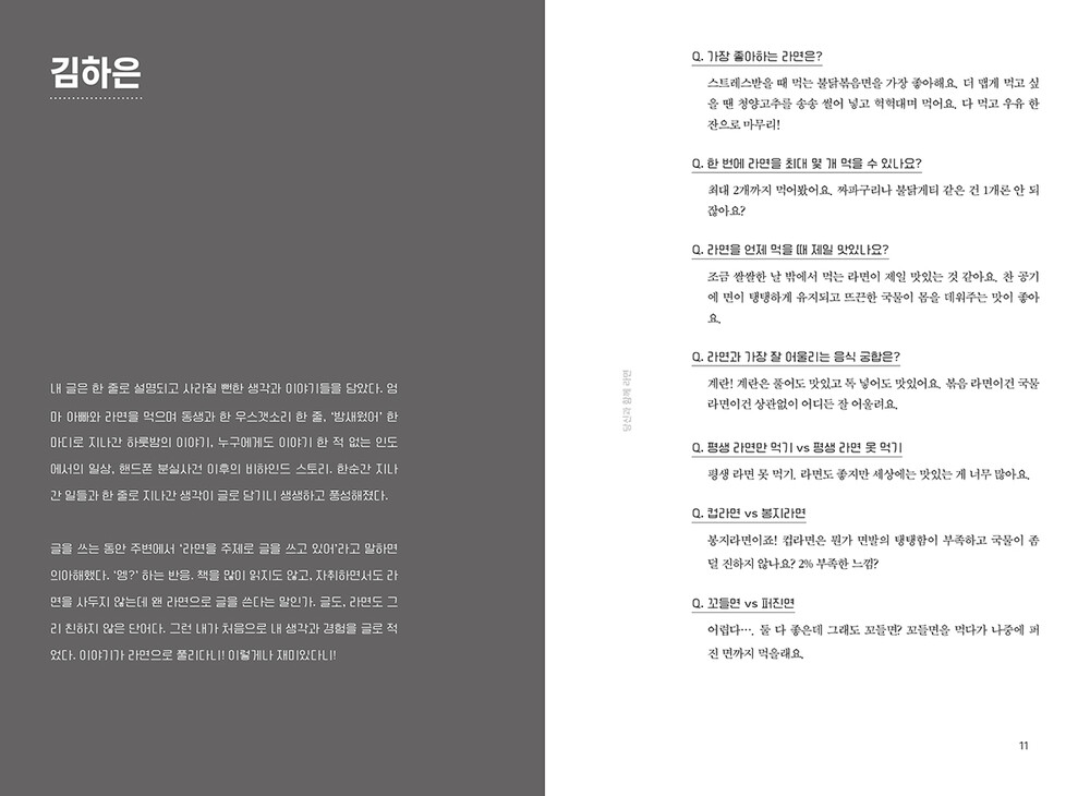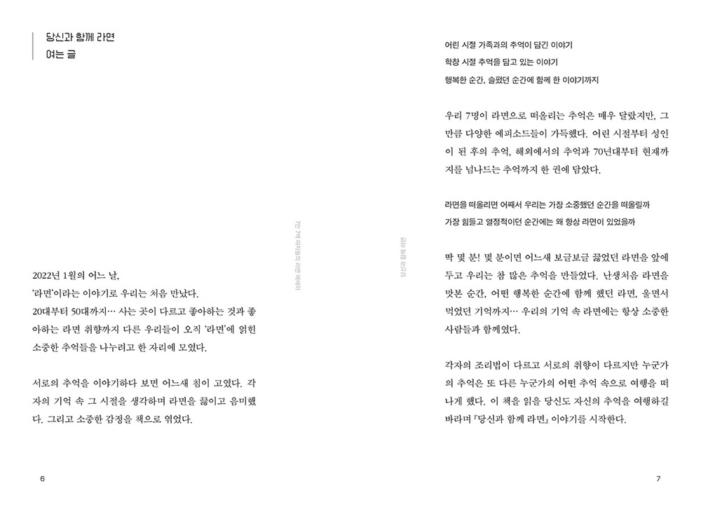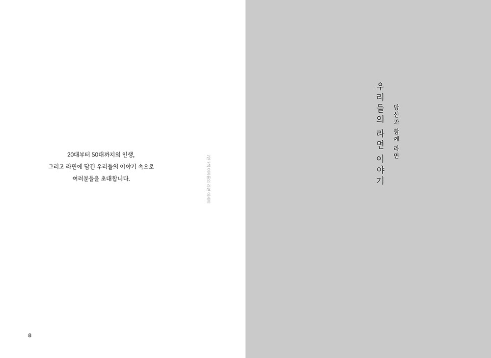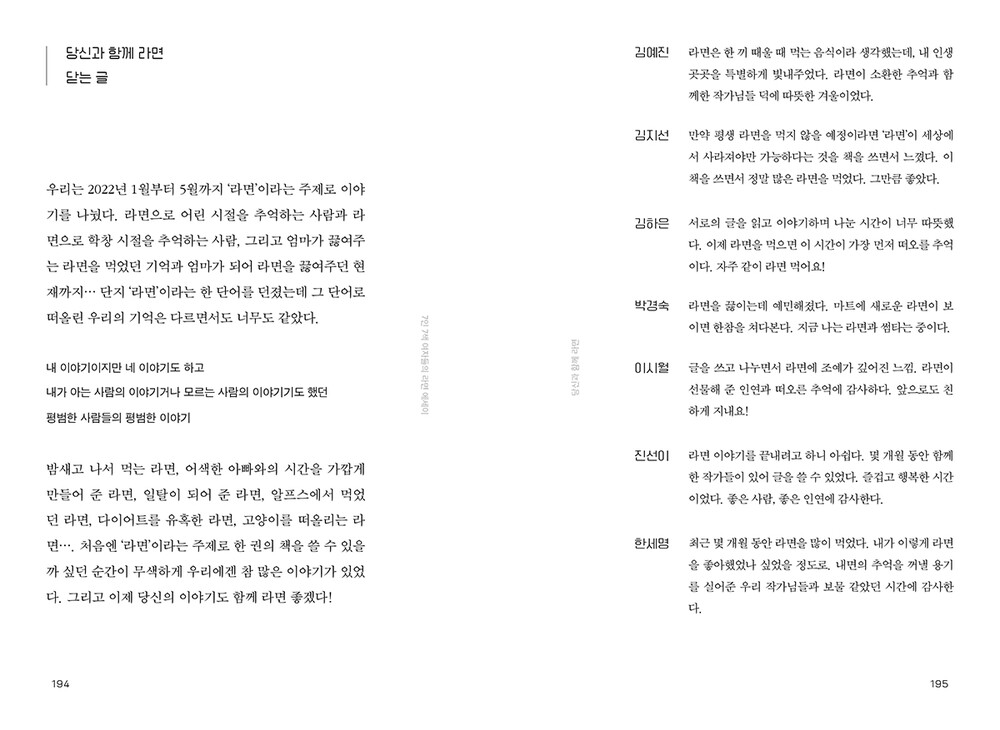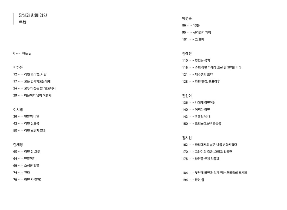 밤새고 나서 먹는 라면, 어색한 아빠와의 시간을 가깝게 만들어 준 라면, 일탈이 되어 준 라면 ,알프스에서 먹었던 라면, 다이어트를 유혹한 라면, 고양이를 떠올리는 라면…. 처음엔 ‘라면’이라는 주제로 한 권의 책을 쓸 수 있을까 싶던 순간이 무색하게 우리에겐 참 많은 이야기가 있었다. 그리고 이제 당신의 이야기도 함께 라면 좋겠다!