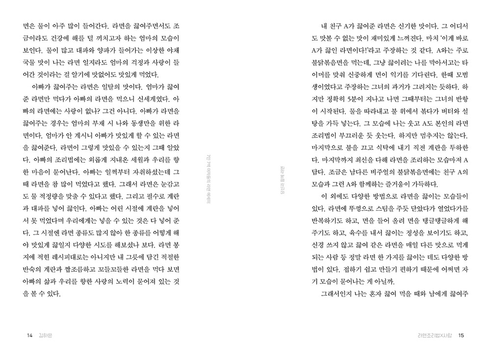 당신에게 누군가 라면을 해준다면, 혹은 오늘 라면을 해먹을 예정이라면 한번 관찰해 보라. 그 사람은 어떤 방법으로 라면을 끓이는지, 나는 어떻게 라면을 끓이는지. 그 사람의 모습에 당신과 함께하는 시간이 어떠한 모습으로 담기는지. -16p