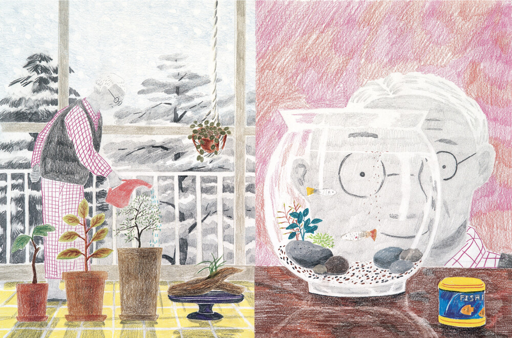 할아버지는 아침을 차려 먹고, 함께 사는 반려 식물과 동물도 챙기고, 티비도 보고 신문도 보며 하루를 살아갑니다. 그리고 시간이 되면 요가학원에 가서 몸을 움직입니다. 수업이 끝나고, 삼삼오오 모여 티타임을 가는 동료들에게 웃으며 인사를 건넵니다. 함께 수업을 듣지만, 따로 시간을 오래 보내는 건 어쩐지 어색합니다.