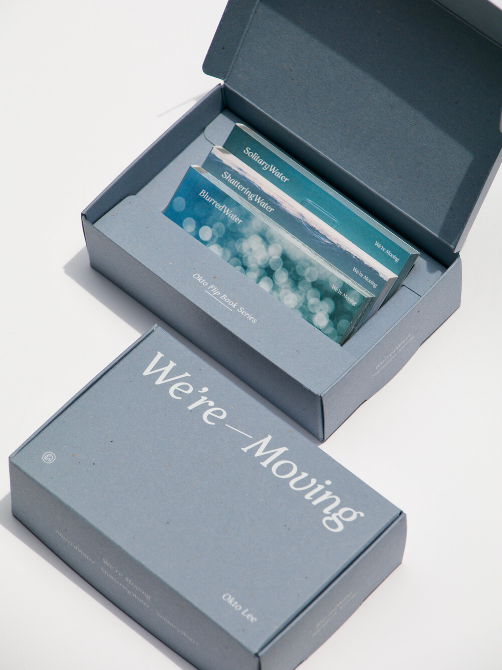 이옥토 사진가의 플립북은 물에 관한 세 가지 영상으로부터 시작합니다. 호수의 윤슬, 바다의 파도, 컵에 담기는 물 한 잔의 움직임을 자유롭게 넘겨보세요. 책상 위와 서랍 속 어디에든 세 가지 푸른 영상을 소장할 수 있습니다.