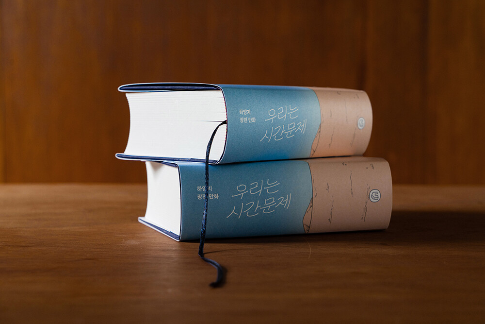 『우리는 시간문제』를 한 권의 양장본으로 만든 까닭은 작가와 출판사 모두 이 만화의 내용이 나뉘지 않고 한 번의 호흡으로 읽히길 바라기 때문입니다. 하양지 작가가 이 책을 위해 새롭게 그린 표지는 마지막 화의 배경과 이어지는 접점이기도 합니다. 뒷면의 비침을 최소화하기 위해 발색이 좋고 두께가 있는 내지 용지를 골랐습니다.