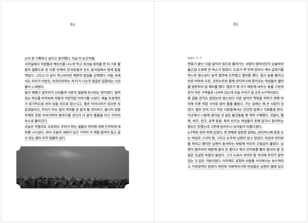 1부와 2부 사이에는 오로민경의 이미지 작업 〈순환하는 마음〉이 컬러 인쇄로 담겨 있다. 우리의 손이 페이지를 넘길 때 서로를 연결하는 스펙트럼으로서 어두움과 밝음의 순환을 담아보고자 한 시도이다.