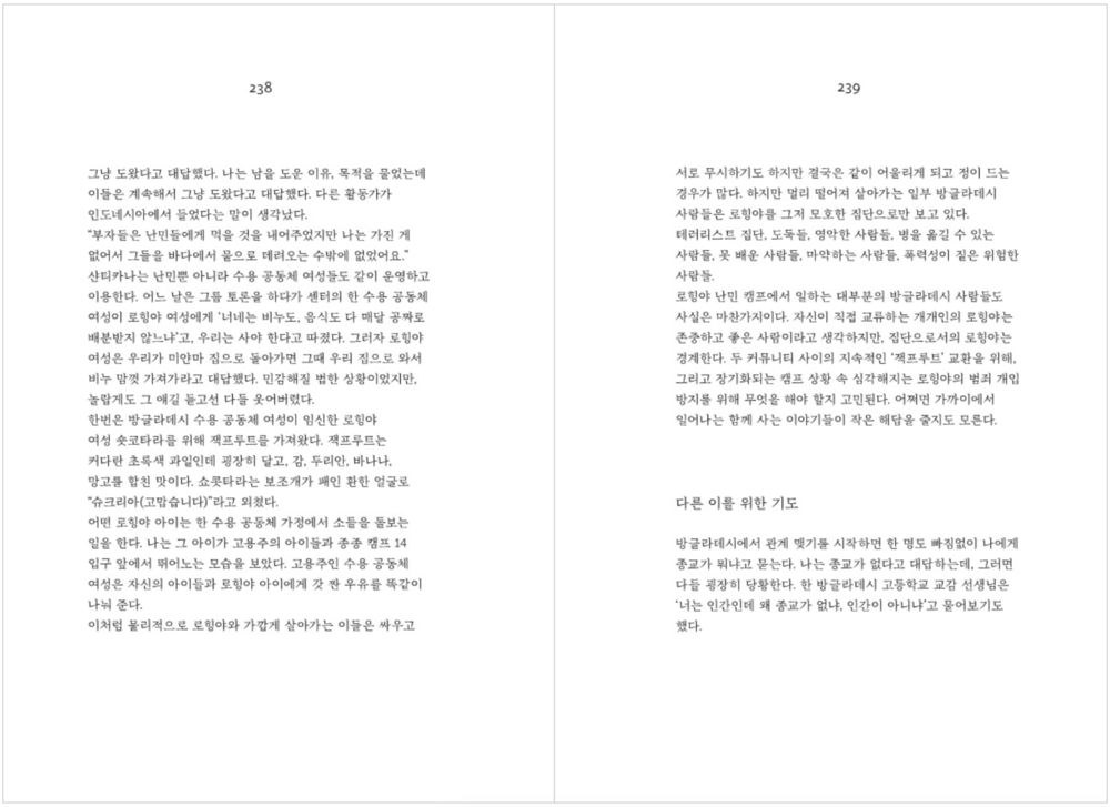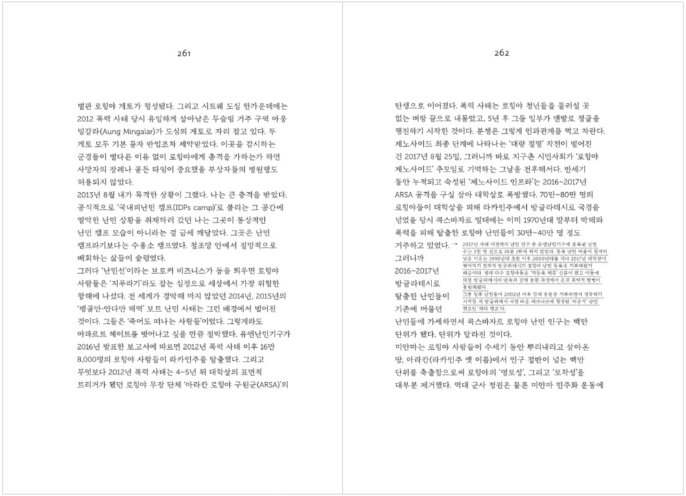이렇듯 이 책은 국제단체의 기획과 지원으로 시작되었지만, 그에 속한, 또는 그와 함께하는 저자들의 일지, 에세이, 미술작품이기도 하고, 생존 당사자 여성들의 목소리와 글, 그림을 담아낸 기록이기도 하며, 잊혀가는 소수민족에 대한 박해의 역사와 부당함을 취재하고 연구해온 베테랑 기자의 르포이기도 하다. 이 다층적이고 사려 깊은 구성이야말로 로힝야 제노사이드의 역사와 현재를 일축하지 않고 드러내는 가장 최선의 방식이었는지도 모른다.