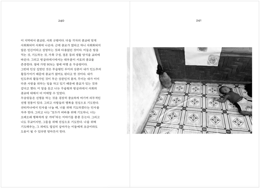 하루는 샨티카나 수용 공동체 여성에게 로힝야 사람들을 도운 이유가 같은 무슬림이어서인지 물었다. 그녀는 다른 종교였어도 도왔을 것이라 대답했다. 이번엔 왜 도왔냐고 물었다. 여성은 그냥 도왔다고 대답했다. 나는 남을 도운 이유, 목적을 물었는데 이들은 계속해서 그냥 도왔다고 대답했다. 다른 활동가가 인도네시아에서 들었다는 말이 생각났다. “부자들은 난민들에게 먹을 것을 내어주었지만 나는 가진 게 없어서 그들을 바다에서 뭍으로 데려오는 수밖에 없었어요.”