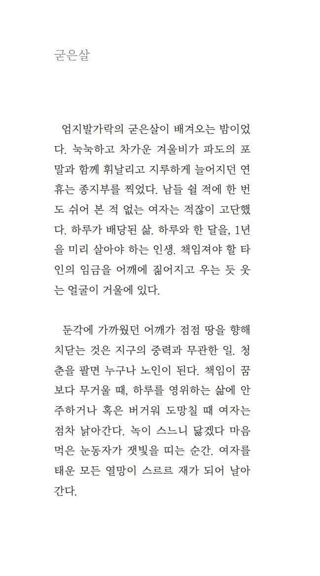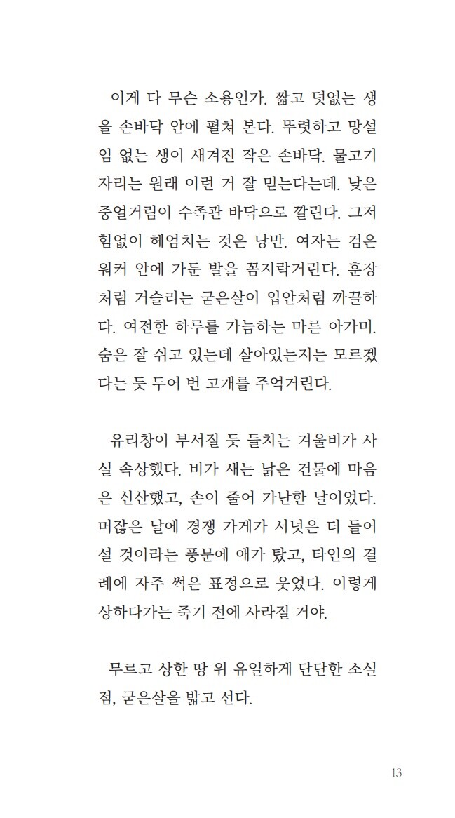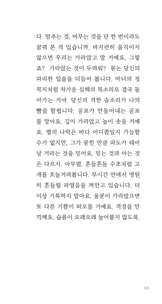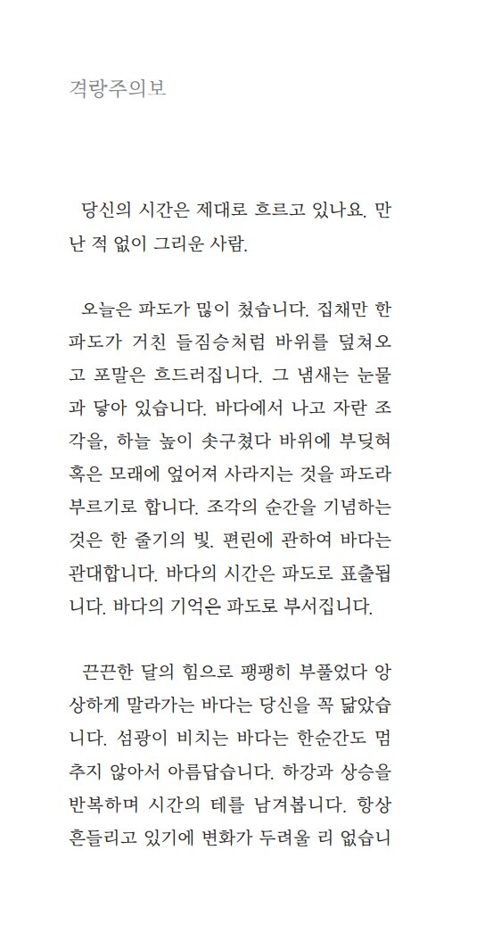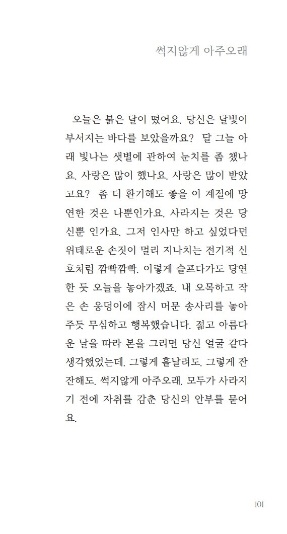 그가 고된 현재와 아련한 과거에서 건져 모은 문장들을 연분홍 지붕을 가진 종이집으로 옮기며 슬프고 그리웠습니다. 꿈과 바다, 우주, 미래로 자유롭게 번지는 문장들을 눈으로 쫓으며 즐거웠습니다. 잠시 시꺼먼 밤의 파도가 된듯 거침없이 자유롭기도 했습니다.