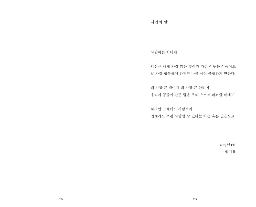 엄지용 시인은 그런일을 잘 하는 것 같다. ‘나’와 ‘너’를 “우리”로 만든는 일. ‘두 사람’을 “한 연인”으로 만드는 일. ‘따로’를 “서로”로 만드는 일. 두 사람의 얼굴을 나란히 두는 일. / 시인 태재