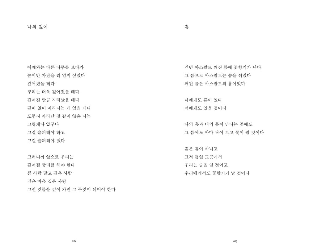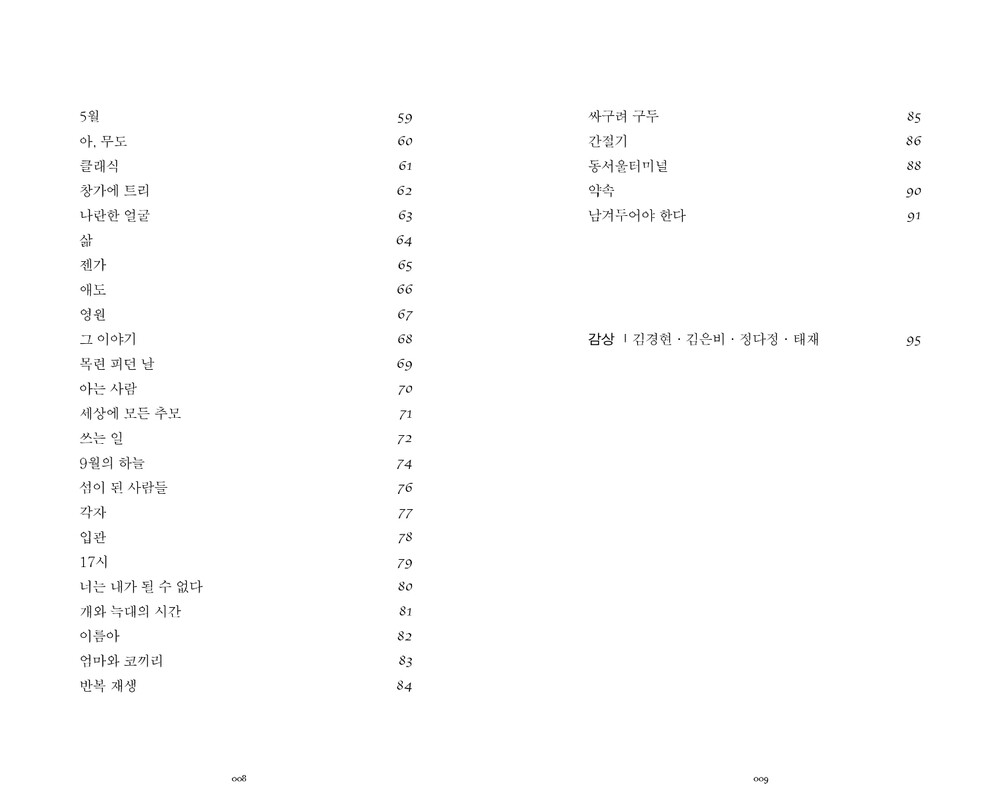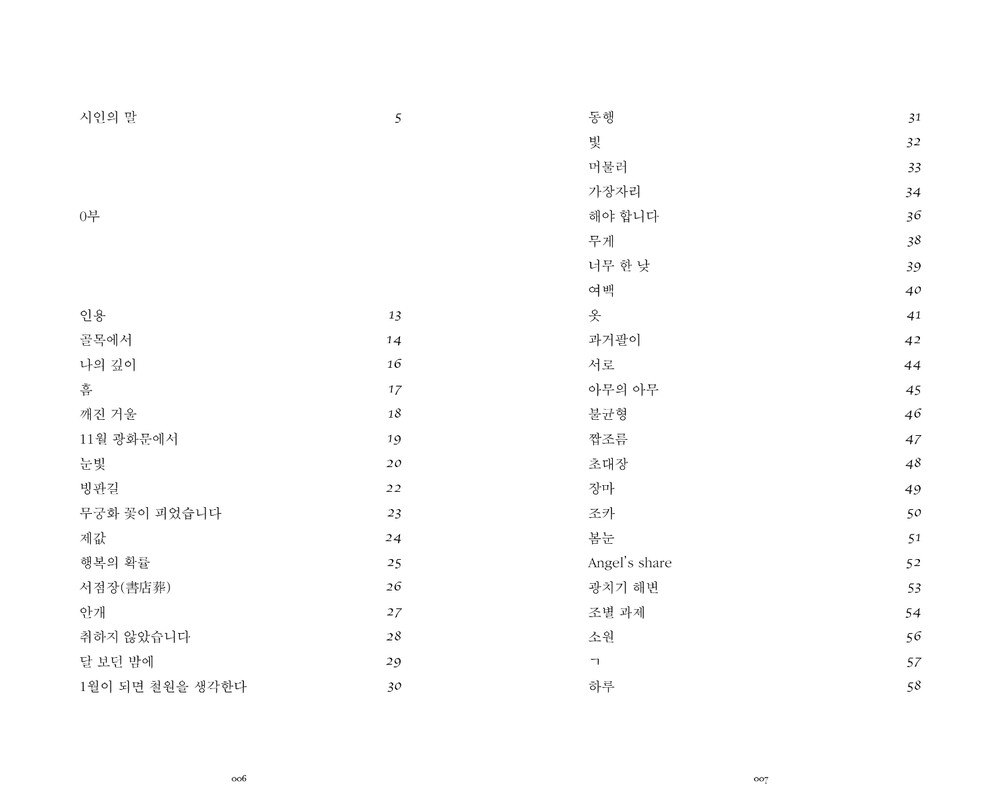 인용 13 / 골목에서 14 / 나의 깊이 16 / 흠 17 / 깨진 거울 18 / 11월 광화문에서 19 / 눈빛 20 / 빙판길 22 / 무궁화 꽃이 피었습니다 23 / 제값 24 / 행복의 확률 25 / 서점장(書店葬) 26 / 안개 27 / 취하지 않았습니다 28 / 달보던 밤에 29 / 1월이 되면 철원을 생각한다 30 / 동행 31 / 빛 32 / 머물러 33 / 가장자리 34 / 해야 합니다 36 / 무게 38 / 너무 한 낮 39 / 여백 40 / 옷 41 / 과거팔이 42 / 서로 44 / 아무의 아무 45 / 불균형 46 / 짭조름 47 / 초대장 48 / 장마 49 / 조카 50 / 봄눈 51 / Angel’s share 52 / 광치기 해변 53 /조별 과제 54 / 소원 56 / ㄱ 57 / 하루 58 / 5월 59 / 아, 무도 60 / 클래식 61 / 창가에 트리 62 / 나란한 얼굴 63 /삶 64 / 젠가 65 / 애도 66 / 영원 67 / 그 이야기 68 / 목련 피던 날 69 / 아는 사람 70 / 세상에 모든 추모 71 / 쓰는 일 72 / 9월의 하늘 74 / 섬이 된 사람들 76 / 각자 77 / 입관 78 / 17시 79 / 너는 내가 될 수 없다 80 / 개와 늑대의 시간 81 / 이름아 82 / 엄마와 코끼리 83 / 반복 재생 84 / 싸구려 구두 85 / 간절기 86 / 동서울터미널 88 / 약속 90 / 남겨두어야 한다 91 /