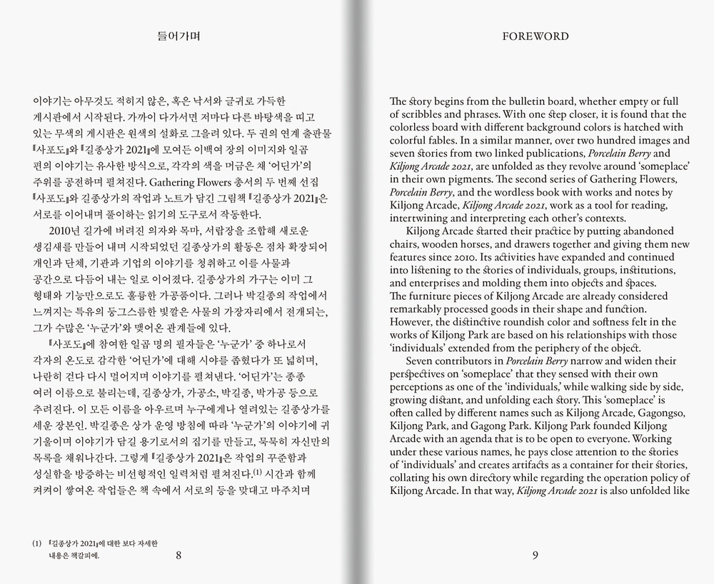 이야기는 아무것도 적히지 않은, 혹은 낙서와 글귀로 가득한 게시판에서 시작된다. 가까이 다가서면 저마다 다른 바탕색을 띠고 있는 무색의 게시판은 원색의 설화로 그을려 있다. 두 권의 연계 출판물 『사포도』와 『길종상가 2021』에 모여든 이백여 장의 이미지와 일곱 편의 이야기는 유사한 방식으로, 각각의 색을 머금은 채 ‘어딘가’의 주위를 공전하며 펼쳐진다.