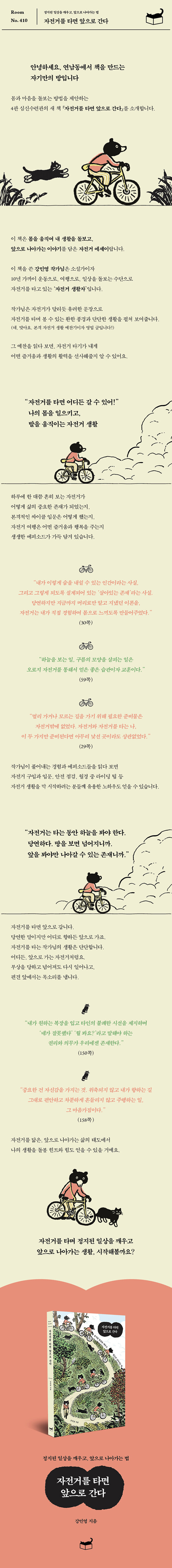 작가님이 꼽는 자전거의 가장 큰 매력은 스스로의 힘으로 어디든 언제나 갈 수 있다는 것, 그리고 어디로 가든 앞으로 간다는 것이에요. 책에는 이런 자전거를 닮은 주체적인 삶의 자세가 녹아 있습니다. 운동하는 여성을 둘러싼 편견, 여성 라이더에 대한 무례함과 고정관념에는 ‘옳지 않다’고 목소리를 내며 앞으로 나아갑니다. 심각한 부상을 겪고 자전거를 못 타게 되었을 때는 포기하지 않고 재활을 해 다시 자전거 위에 오릅니다. 때때로 불어오는 맞바람에는 주행 속도를 줄이며 유연히 대응하며, 천천히 앞으로 나아갑니다. 이를 인간관계와 갈등을 마주하는 방식으로 삼기도 해요. 자전거를 타며 하늘을 바라보거나 나와 내 주변을 관찰하며 사소한 풍경까지 가득 담는 습관또한 자전거가 알려준 생활의 태도, 삶의 자세입니다. “자전거를 탈 때처럼 똑바로 앞을 보고 어깨를 펴고 걸으려 노력한다. 하늘을 보는 일, 구름의 모양을 살피는 일은 오로지 자전거를 통해서 얻은 좋은 습관이자 교훈이다.”(99쪽) 나를 돌보며 앞으로 나아가는 생활, 자전거를 타며 시작해보는 건 어떨까요?