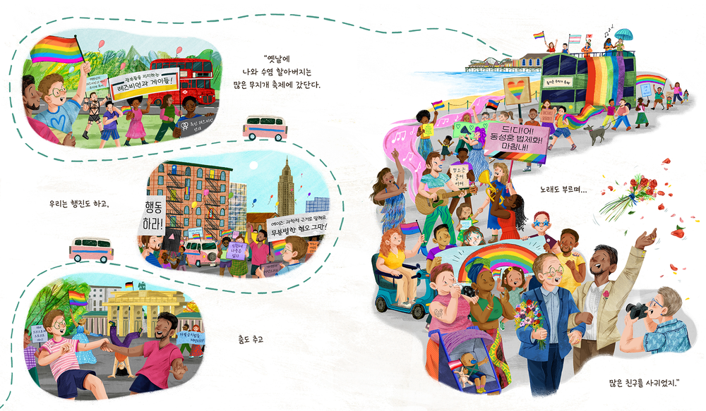 런던 프라이드에 가기 어려운 할아버지를 위해 주인공 밀리가 마을 축제를 열었던 것처럼, 이 책이 전국의 도서관에 꽂혀 책장마다 무지개 축제를 열어줄 수 있길 바랍니다.