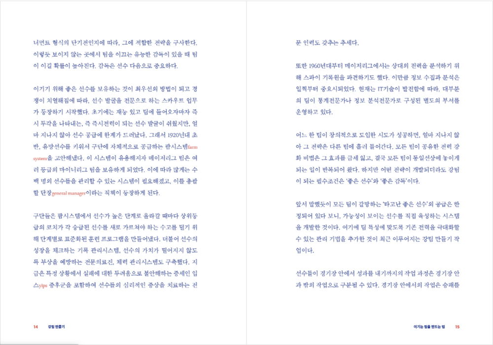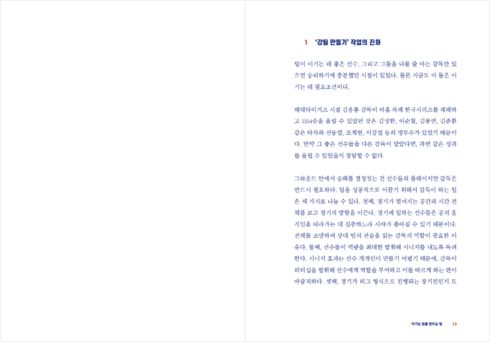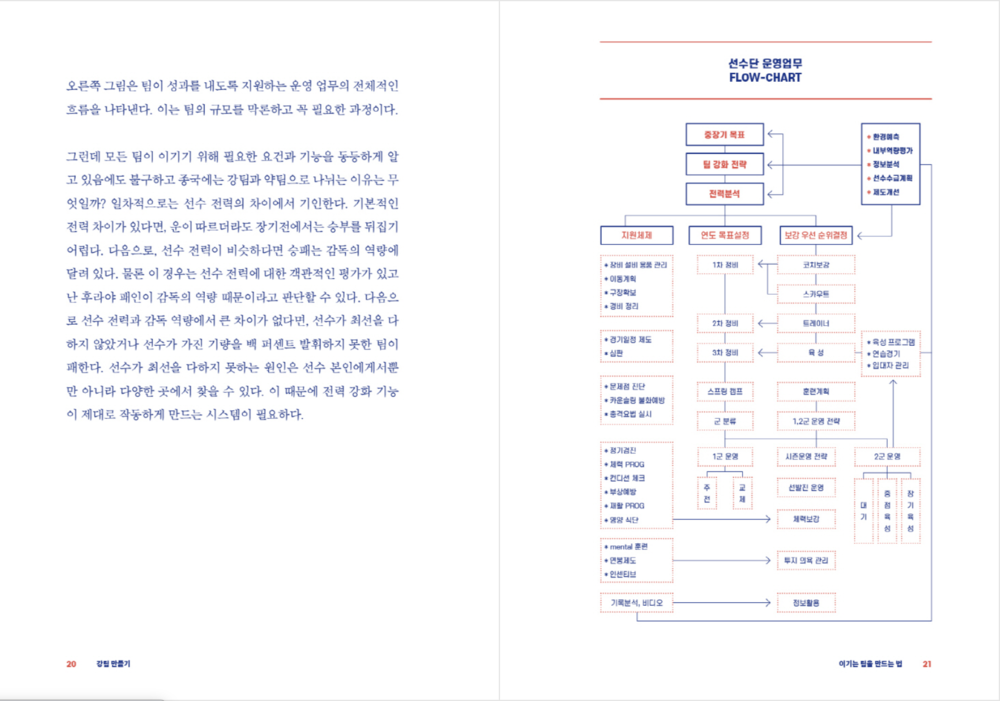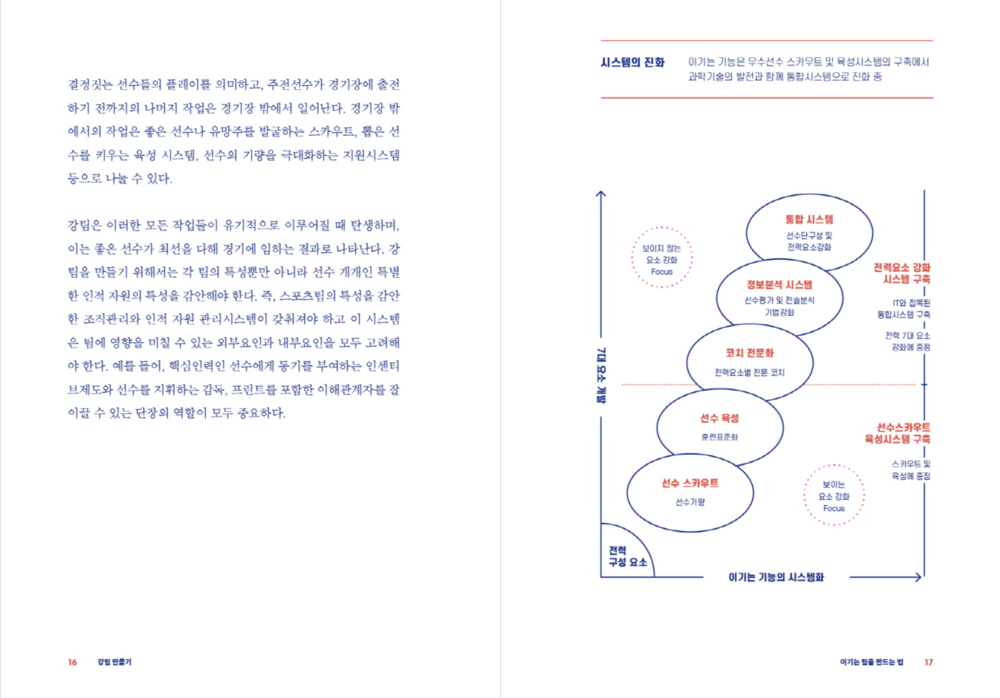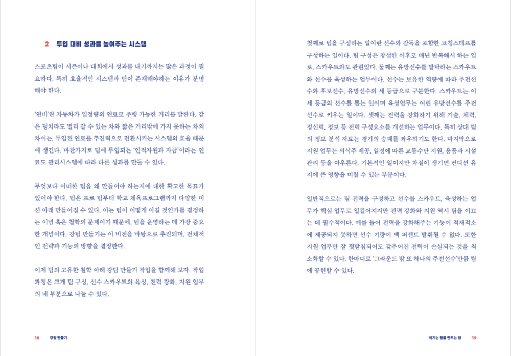 이 책은 한정된 자원에도 불구하고 강팀을 만들고자 하는 이들이 어떻게 시스템을 구축할 수 있는지 자세하게 밝히고 있다. 강팀을 설계하고자 고군분투하는 모든 이들, 승리를 위하여 보이지 않는 곳에서 열심히 뛰고 있을 많은 이들에게 이 책을 전한다.