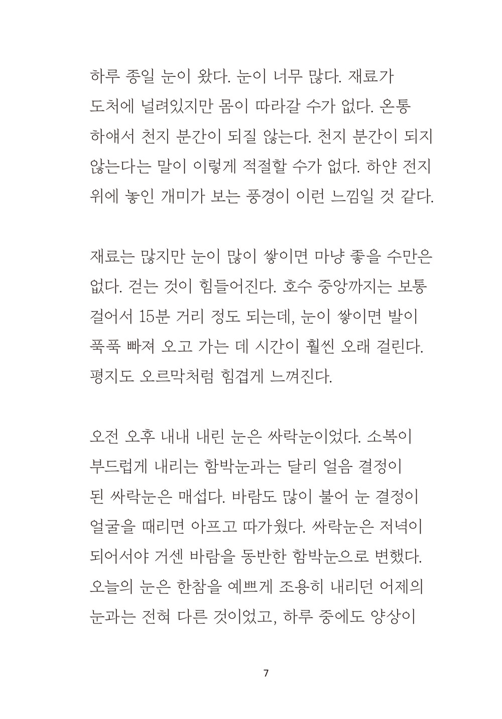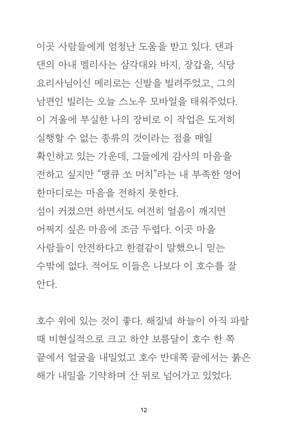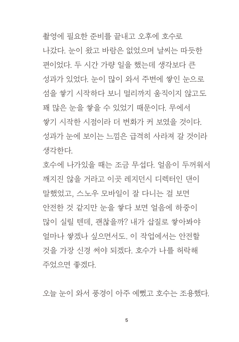 저자는 매일 삽질을 마치고 숙소로 돌아오면 일지를 기록했다. 일지의 첫 줄에는 최고온도와 최저온도, 바람의 세기와 눈의 유무 등 그날의 기상 정보를 꼼꼼히 적는다. 그리고 일지의 마지막 줄은 대부분 같은 문장으로 끝난다. 이 호수가 내일도 무사하기를 빈다는 말로. 작업 과정의 대부분이 영하를 오가는 추운 날들을 배경으로 하고 있지만 그 내부에는 따뜻한 온기가 느껴진다. 호수의 안녕을 비는 마음이 호수를 비롯해 그것을 잠시 터전 삼은 나의 안녕과 세상의 안녕을 기원하는 마음으로까지 확장되어 읽히기 때문일 것이다.