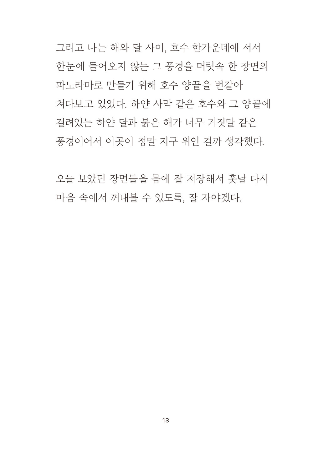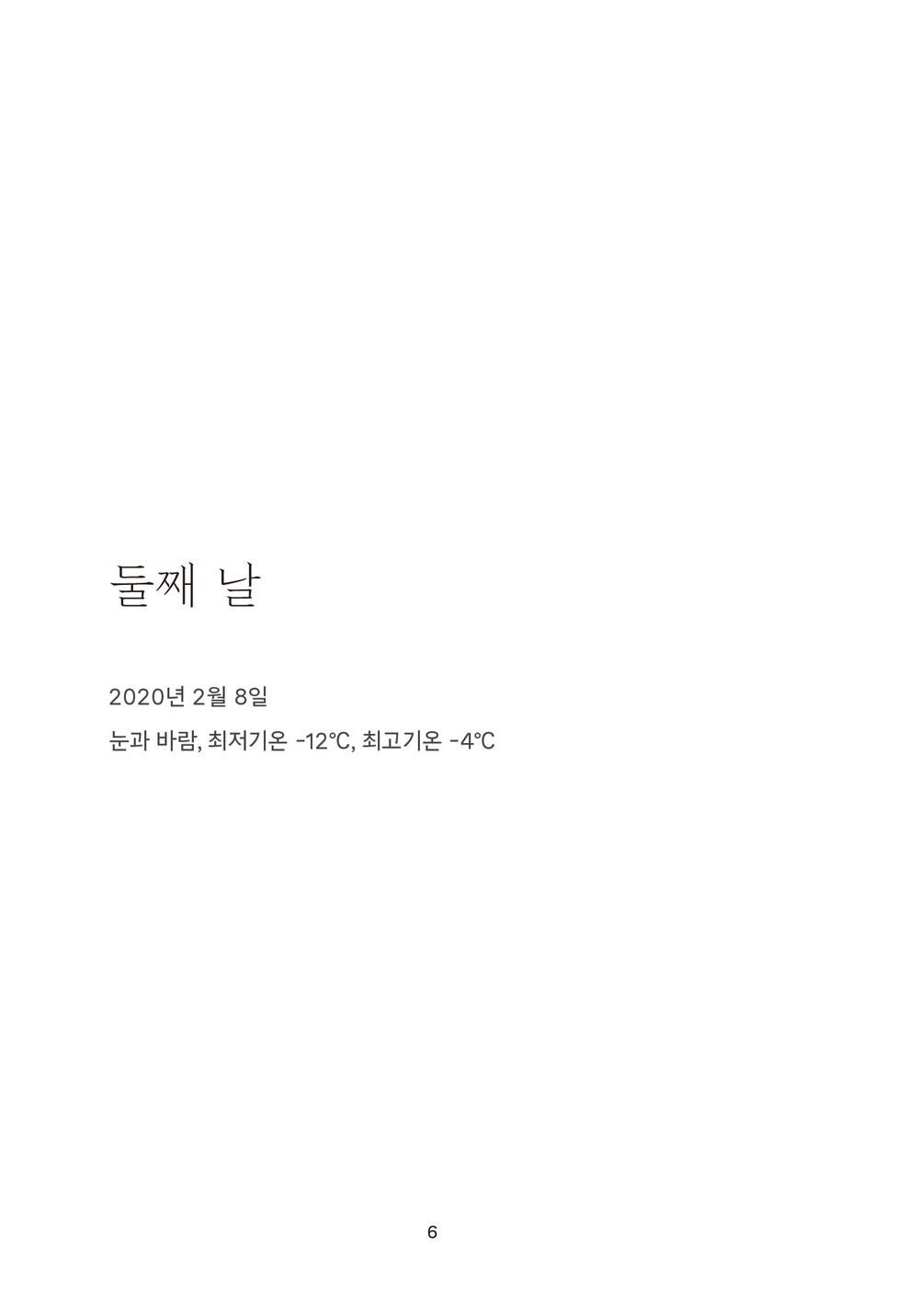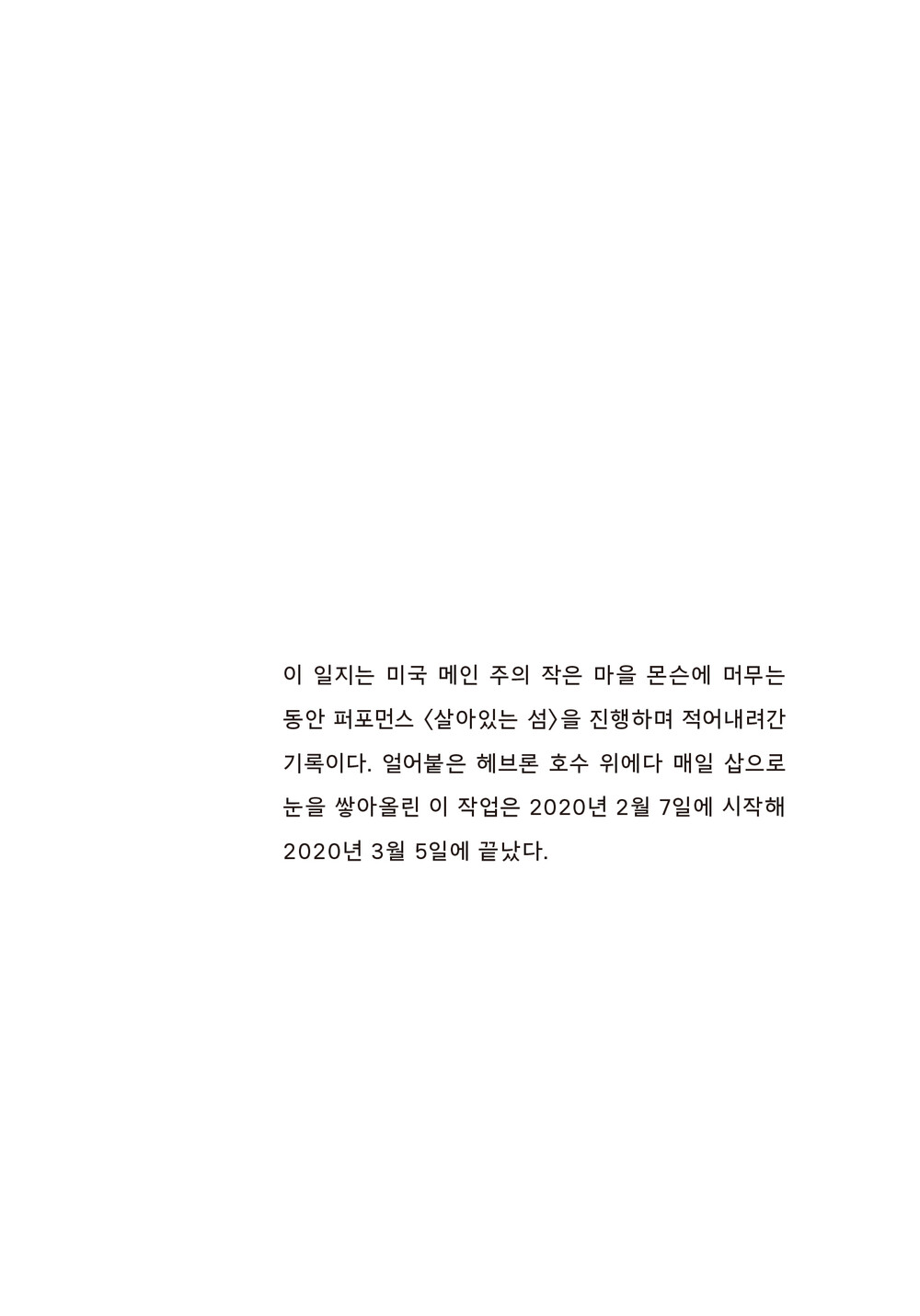 저자는 매일 삽질을 마치고 숙소로 돌아오면 일지를 기록했다. 일지의 첫 줄에는 최고온도와 최저온도, 바람의 세기와 눈의 유무 등 그날의 기상 정보를 꼼꼼히 적는다. 그리고 일지의 마지막 줄은 대부분 같은 문장으로 끝난다. 이 호수가 내일도 무사하기를 빈다는 말로. 작업 과정의 대부분이 영하를 오가는 추운 날들을 배경으로 하고 있지만 그 내부에는 따뜻한 온기가 느껴진다. 호수의 안녕을 비는 마음이 호수를 비롯해 그것을 잠시 터전 삼은 나의 안녕과 세상의 안녕을 기원하는 마음으로까지 확장되어 읽히기 때문일 것이다.