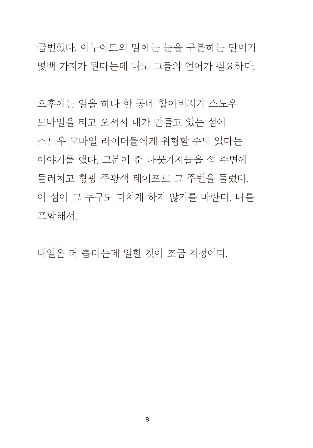 p.41 하양을 한 삽 떠다가 다른 하양 위에 놓는다. 하양을 쌓는다. 하얗고 하얗고 하얗다. 온통 하얘서 내가 제대로 하고 있는 것인지 모르겠다. 저번엔 한 동료 작가가 내게 물었다. 봄이 되어 이 섬이 사라지는 모습을 보고 싶지 않냐고. 잘 모르겠다. 이 섬의 마지막을 보고 싶은 것인지 아닌지. 이 섬은 또한 필멸의 존재이다. 그리고 봄이 되면 죽을 것이다. 알 수 없는 그 미지의 세계로 들어가는 섬을 나는 보고 싶은 걸까, 보고 싶지 않은 걸까. 그것을 본다면 내 마음은 어떨까, 보지 않는다면 그것은 또 어떤 마음일까.