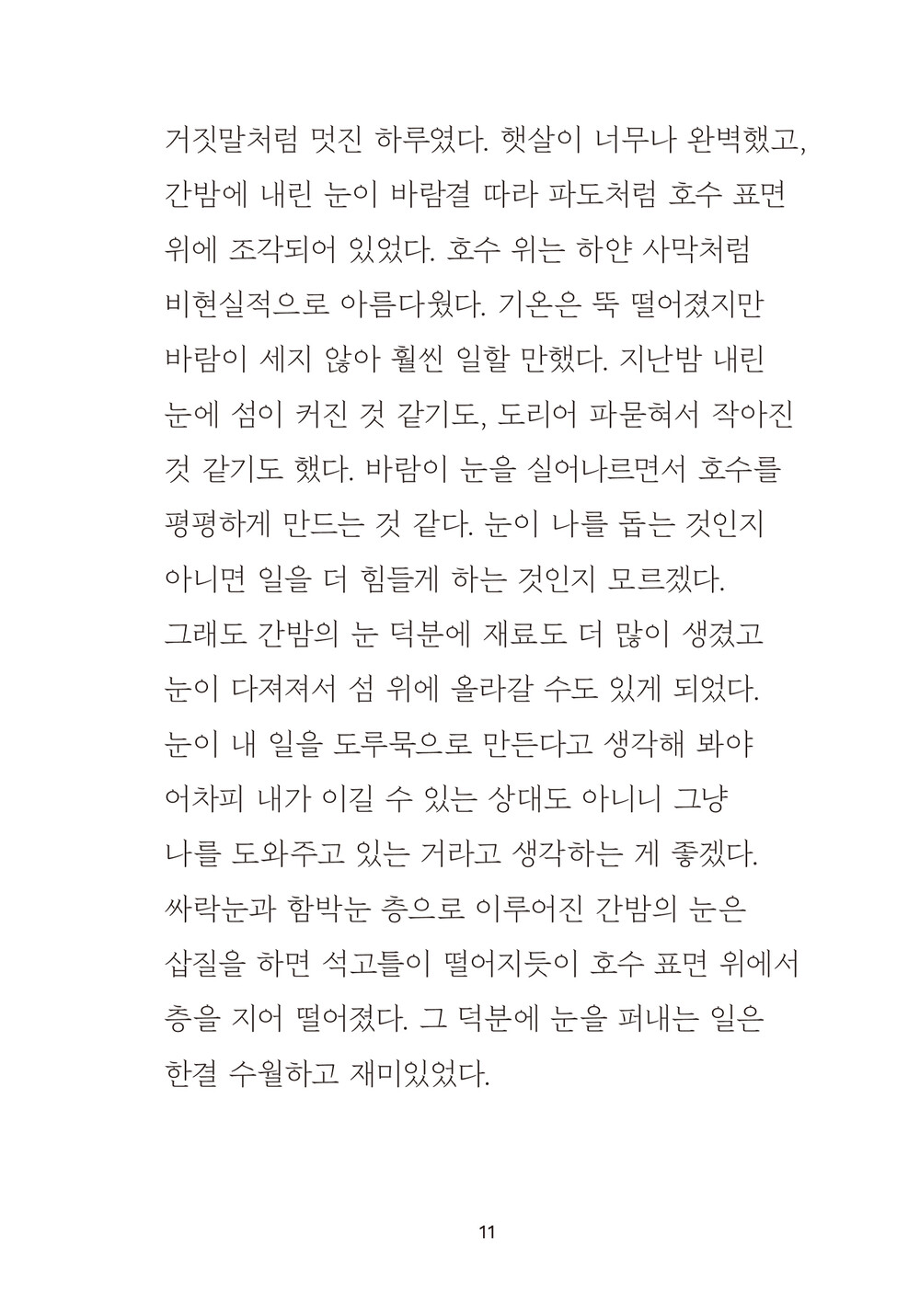 p.23 눈을 가만히 들여다보면 눈 결정이 매일 조금씩 다르다. 오늘 온 눈은 육각형의 별 같은 결정이 아니라 옆으로 길게 찢어진 생김새를 가지고 있었다. 매일 보는 눈이 모양새도, 맛도, 냄새도, 촉감도 다 다르다. 하루가 무섭게 간다. 호수에 나가 일하고 있으면 금세 해가 진다. 삶이 단순하다. 내일도 호수님이 무사하시기를, 그리고 나도 무사하기를 바란다.