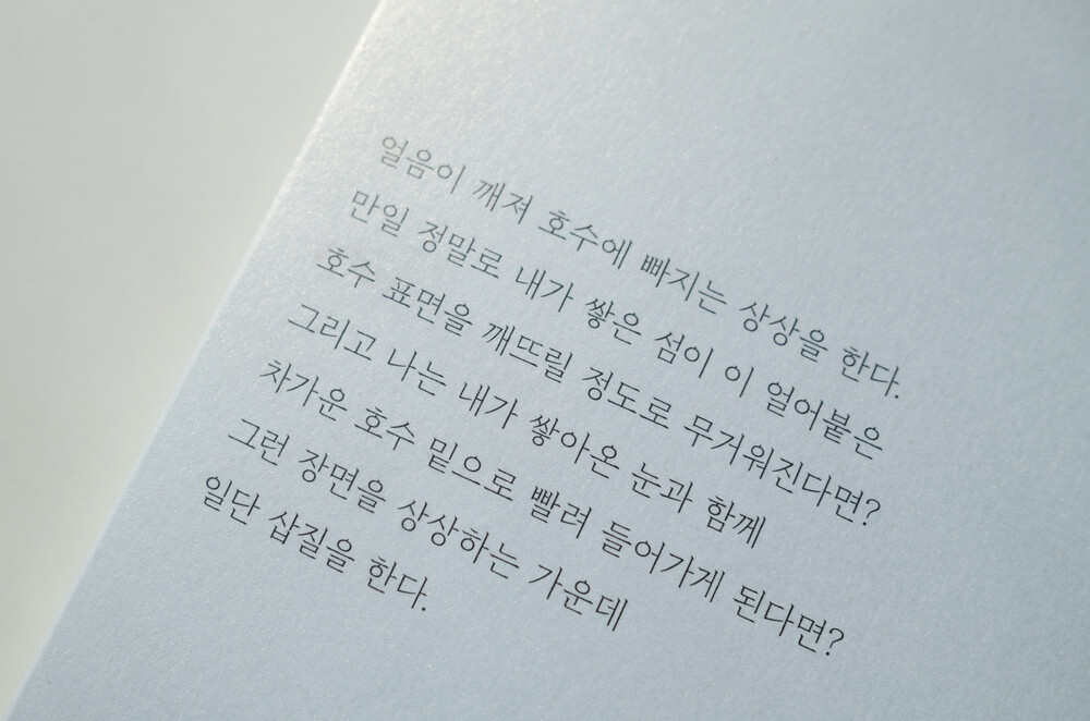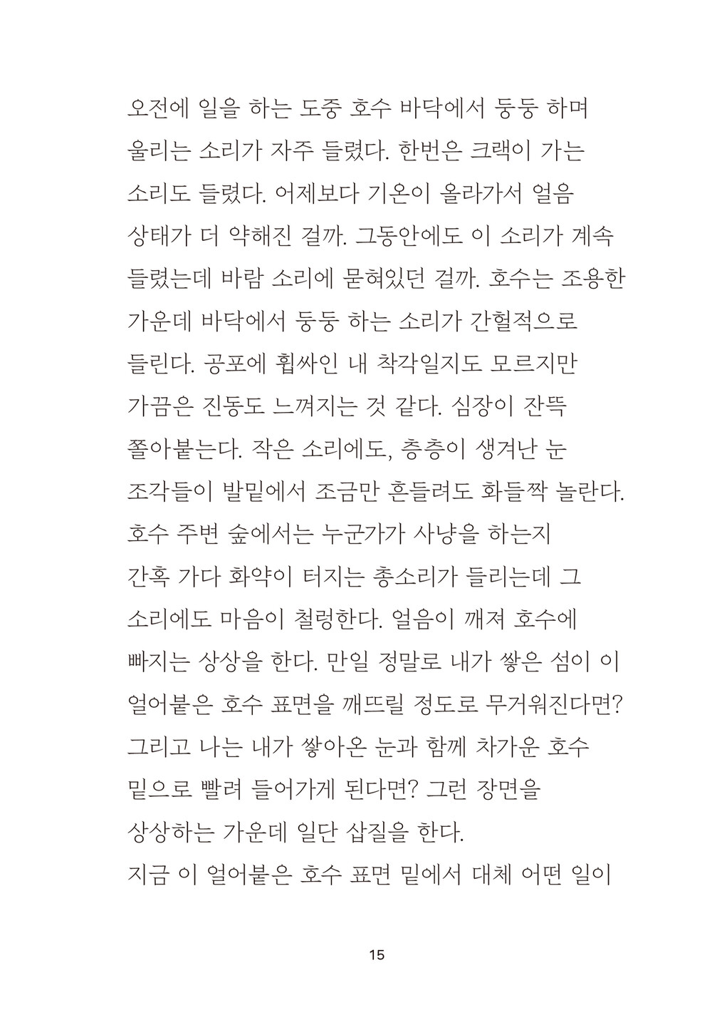 p.15 얼음이 깨져 호수에 빠지는 상상을 한다. 만일 정말로 내가 쌓은 섬이 이 얼어붙은 호수 표면을 깨뜨릴 정도로 무거워진다면? 그리고 나는 내가 쌓아온 눈과 함께 차가운 호수 밑으로 빨려 들어가게 된다면? 그런 장면을 상상하는 가운데 일단 삽질을 한다.