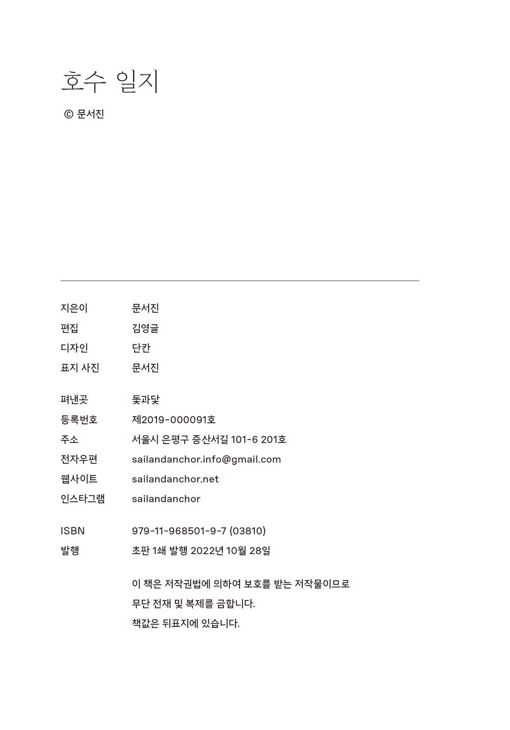 시리즈의 첫 책으로 『호수 일지』를 펴낸다. 『호수 일지』는 문서진 미술작가가 미국 메인 주의 작은 마을에 한 달간 머무르면서 진행한 퍼포먼스 작업 <살아있는 섬>의 과정을 기록한 책이다. 저자는 꽁꽁 얼어붙은 겨울 호수 위에 매일 삽으로 눈을 쌓아올려, 봄이면 사라질 일시적 섬을 만들기 시작한다. 영하의 기온 속에 섬의 면적이 점점 불어날수록 그 무게로 인해 호수의 표면이 깨져 물에 빠질지 모른다는 두려움도 커진다. 하지만 작가는 삽질을 계속한다. 자신이 이 작업을 왜 수행하는지 모르는 채로, 호수가 들려줄 대답을 기다리면서. 그 느리고 고요한 시간이 쌓여 무용하고도 아름다운 삽질의 기록이 되었다.