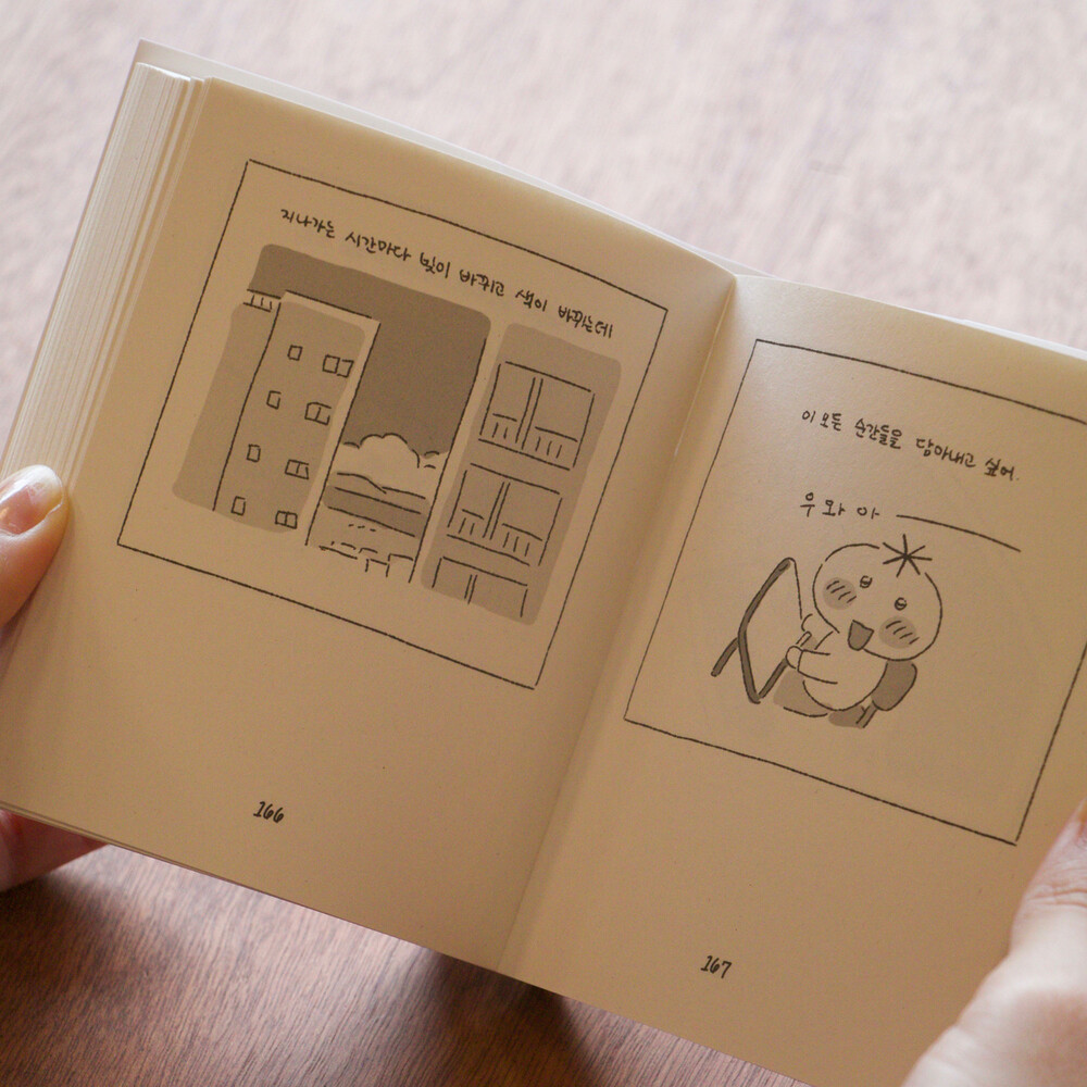 “해야 할 일들을 차곡차곡 정리해서 옷의 주머니에 넣고 손을 가볍게 만들어. 좌우로 휘휘 저으며 걸어가. 덕분에 나의 마음은 때때로 그리고 자주 말랑해져. 지나가다 본 귀여운 순간들, 눈을 이끌던 순간들을 놓치지 않고 시선의 뜰채로 거두어 전해줘. 그러면 같이 있던 그 사람과 함께 한번 더 웃을 수 있어.”