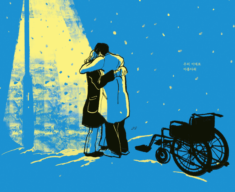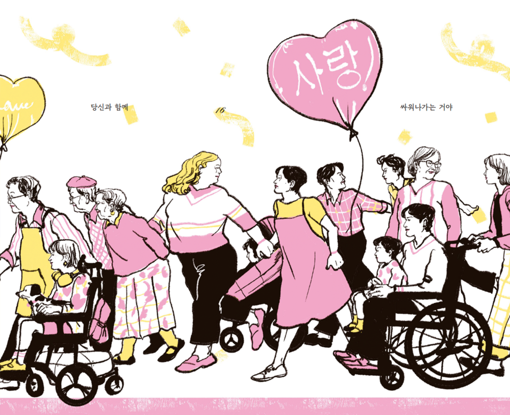황푸하의 “넌 나의 것이야”가 아닌 “넌 너의 것이야”라고 말하는 다정한 노랫말과 다양한 성별, 연령, 장애인과 비장애인이 함께 등장하는 엄주의 단단한 그림은 함께 어우러져 우리 곁의 수많은 ‘사랑’을 전한다. 다채로운 관계 속에 피어나는 사랑, 함께 싸우러 나가는 사랑, 있는 그대로 존중해 주는 사랑. 시집을 연상시키는 이 작고 싱그러운 분홍색 책이 많은 이들의 새해 첫 사랑 이야기가 되길 바란다.