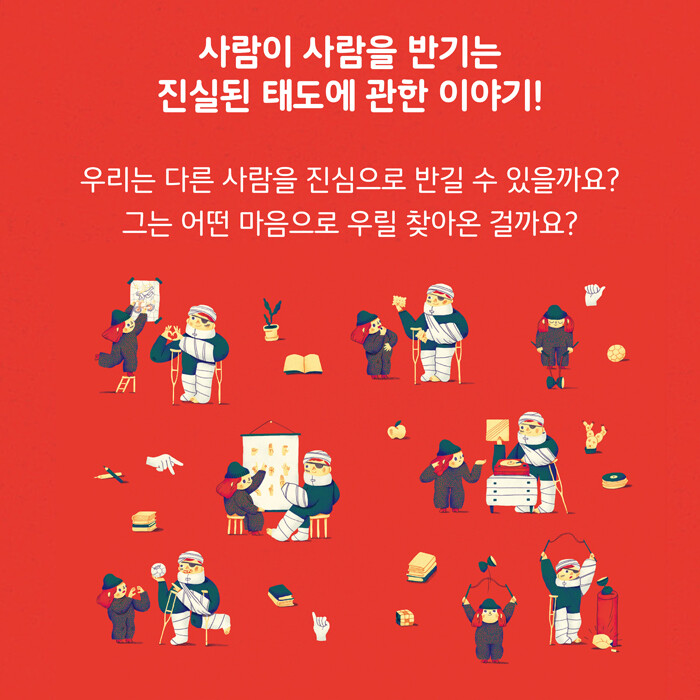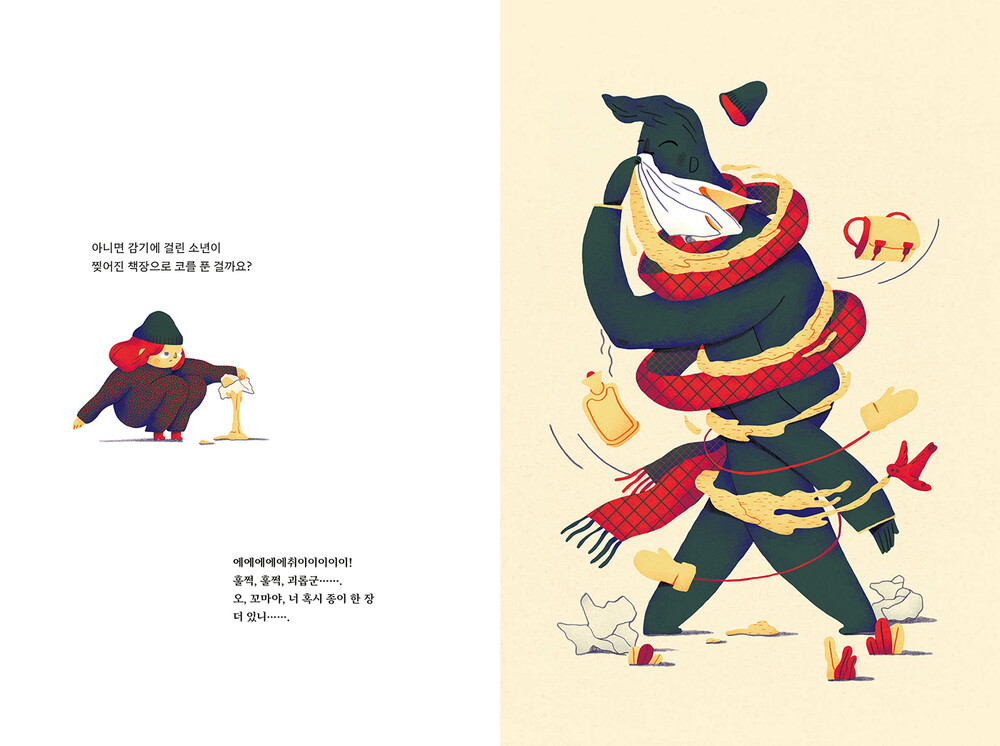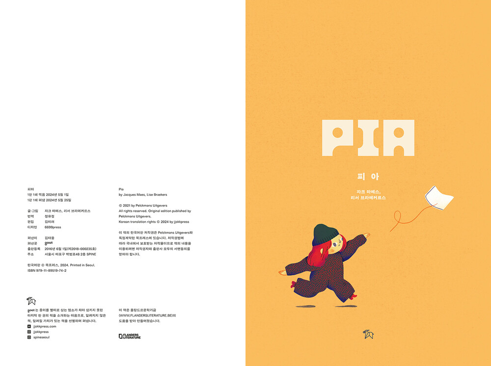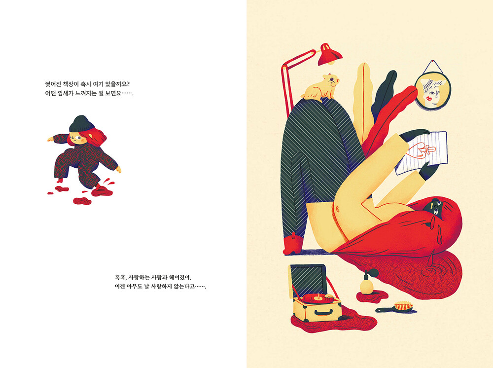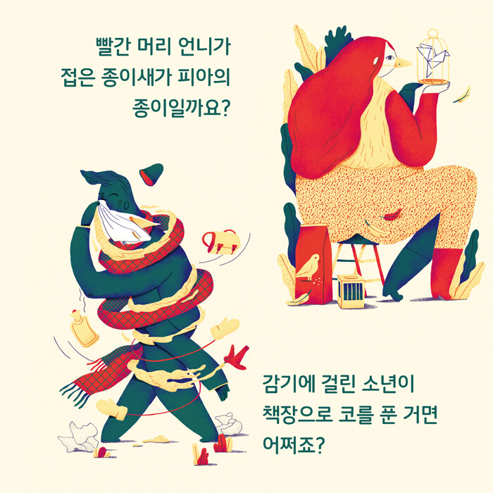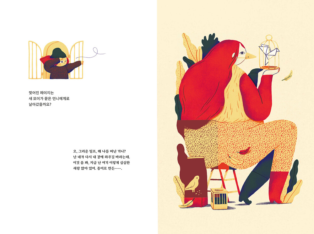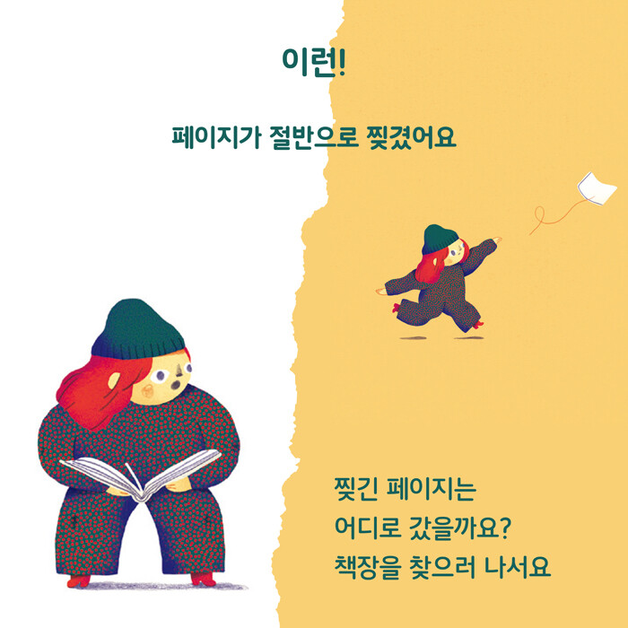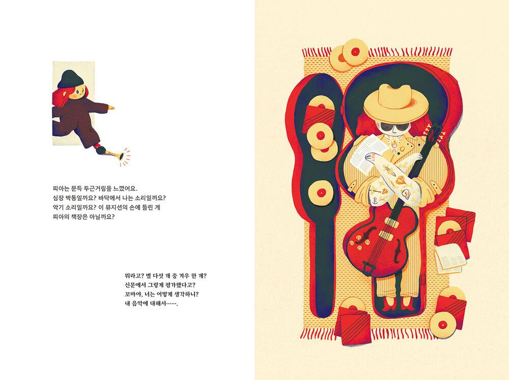 사람마다 관심사가 다르고 표현하는 방법도 다르다. 종종 그 사실을 잊을 뿐. 그리하여 입는 마음의 상처가, 물론 있다. 이 책의 주인공 피아는 아름다운 책을 가지고 있다. 그런데 한 페이지가 찢어져 바람에 날아가버리는 바람에 피아는 모험을 떠나게 된다. 그렇게 나선 길 위에서 피아는 몇 명의 사람을 만난다. 피아는 정작 그들의 사연에는 큰 관심이 없고, 서로 친구가 되기는 틀린 듯하지만. 하지만 피아의 무신경함에도 이유가 있지 않을까? 단 세 가지 색상으로만 그려진 독특하고 예술적인 그림을 따라 피아의 여정을 따라가보기를 권한다.