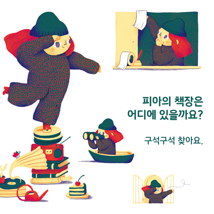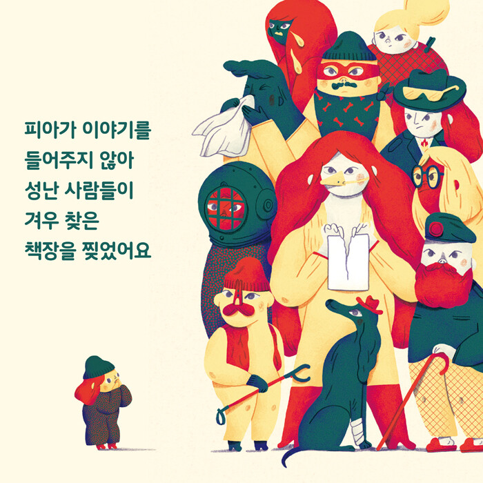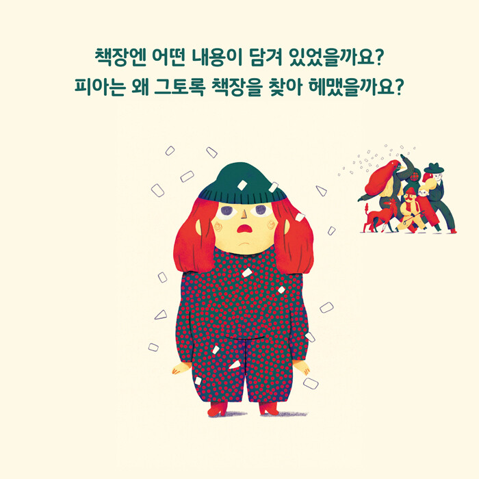 피아는 가장 아끼는 책에서 그것도 가장 아끼는 페이지 하나를 잃는다. 페이지를 되찾고 싶어 떠난 피아의 모험은 당연하게도 여러 장소를, 여러 사람을 거쳐간다. 피아가 도움을 미처 구하기도 전에, 각자의 딱한 사연을 들려주기 시작하는 사람들. 하지만 그 어느 누구도 피아의 관심과 행동을 끌지는 못하는데. 자신에게 중대한 문제에 몰두해 있는 피아. 우리는 어떤 감각을 이용하여 이 친구의 숨은 마음을 읽어낼 수 있을까.