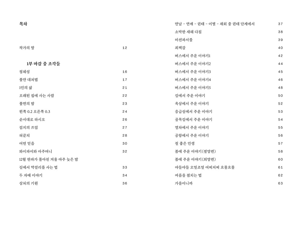 : 컴퓨터와 외장하드가 바뀔 때마다 삭제되지 않고 살아남는 폴더가 있다. 폴더명은 ‘소설의 조각들’. 그때그때 떠오른 문장이나 장면을 무작위로 써놓는 저장고 같은 곳이다. 문장 수로 따지면 방대한 양이지만, 실제 쓸모 있는 문장은 몇 개 없다. ‘소설의 조각들’만큼 오랜 시간을 따라다닌 다른 폴더는 ‘마감 중 조각들’이다. 자발적인 마감이 아닌 누군가 정해준 마감을 지켜야 하는 직업인으로써 나는 언제나 마감 중이었고, 마감 중에 생기는 단편의 일들을 작성해놓은 것이다. 길을 가다 마주친 사람의 모습, 버스 안에서 바라본 거리의 모습, 옥상에 죽어있는 백로의 모습, 옆집 할머니의 친목생활 등등. 서로 관련 없어 보이지만, 아침부터 저녁까지 주변에서 일어나고 없어지는 장면을 기록했다는 점에서는 공통점이 있는 글 모음이다. 일기를 쓰기에는 번거롭고, 어느 순간은 밀봉된 기억으로 잡아두고 싶을 때 조각 글을 추천한다. 이 책이 누군가에게 조각 글을 쓸 수 있는 작은 계기가 되길 바란다.