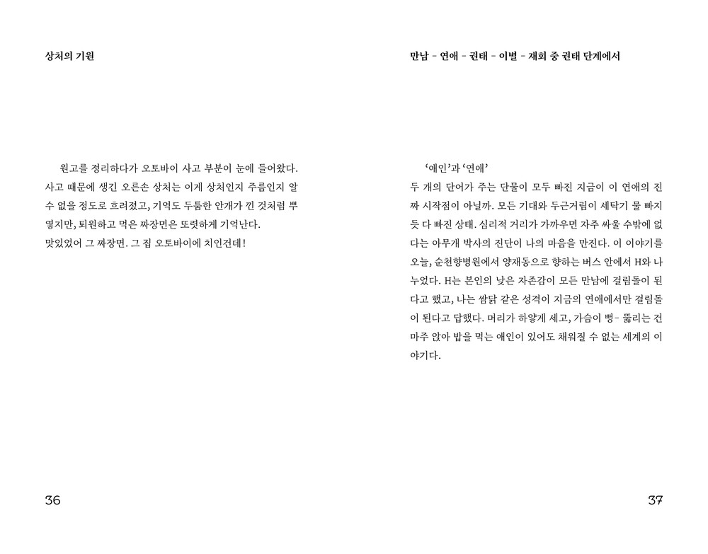 예상하지 못한 허기가 찾아오면 밝게 쓰라던 차장이 생각난다. 그 말이 아직 나의 손가락을 잡고 있는 걸 보면 밝은 글을 쓸 팔자는 아닌 것 같고, 묘하게 밝게 살라는 말처럼 들리는 건 자격지심일까. 이런 삶과 저런 삶의 경계에 살고 있다고, 이런 삶도, 저런 삶도 아닌 곳에 사는 사람도 있다고 이야기하고 싶었다. 눈에 보이지 않으면 없는 존재로 치부하는 건 치사하다.
