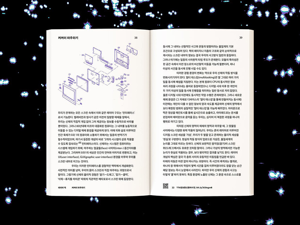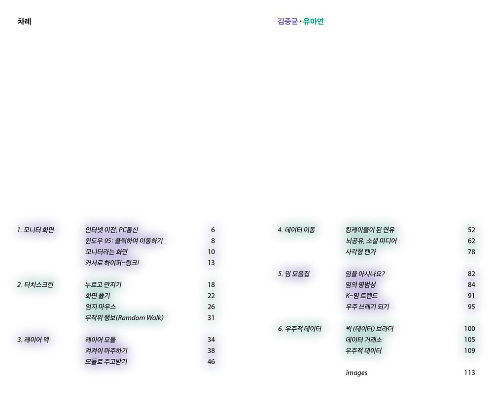 <i의mage>는 ‘모니터 화면’, ‘터치스크린’, ‘레이어 덱’, ‘데이터 이동’, ‘밈 모음집’, ‘우주적 데이터’의 6개 장으로 구성된다. 1장 ‘모니터 화면’에서는 PC통신을 기점으로 전개된 ‘창’ 속의 새로운 세상을 소개하고, 그 속으로 들어가기 위해 사용하는 키보드와 마우스를 확장된 신체로서 제시한다. 더 나아가, 마우스에 달린 ‘커서’에 주목하며, 그 기호 위로 우리의 모든 움직임을 투사하는 하이퍼-링크의 작동을 살핀다. 이러한 접근은 신체와 스크린이 직접 접촉하는 방식을 다루는 2장 ‘터치스크린’으로 이어진다. 정전기를 통해 오가는 미세한 터치 감각은 더이상 스크린 속에 갇혀 있지 않다. 입체감을 제공하는 전기적 자극은 이제 피부를 넘어 몸 전체로 번지고 있는 것이다. 이렇게 피부 감각이 되어버린 ‘터치’는 스크린 위에서 Z축의 등장을 새로이 알렸다. 이후 3장 ‘레이어 덱’은 우리가 거주하는 디지털 세계 속 ‘레이어 모듈’을 소개한다. 구체적으로 본 장에서는 모듈로 이루어진 디지털 세상만의 특질을 살피며, 선형적 연속체로 이루어진 물질적 현실과 이를 비교해 본다. 그 과정에서 생기는 가상의 영역과 현실의 영역 사이의 맞물림을 통해, 동시대의 우리가 가져야 할 새로운 디지털 리터러시가 무엇인지 파악할 수 있다. 전반부에서 신체와 디바이스가 마주하는 방식에 대한 논의가 주를 이루었다면, 뒤따르는 후반부에서는 디지털 매체 환경을 구성하는 ‘데이터’ 자체에 주목한다. 4장 ‘데이터 이동’은 정보가 생산되고 유통되는 과정 전반이 이를 소비하는 개인의 정체성과 사고방식 형성에 결정적임을 밝힌다. 하루 동안 마주치는 무한의 데이터는 여러 플랫폼을 넘나들며 우리의 페르소나를 더욱 선명하게 묘사한다. 그 속에서 우리의 존재 또한 물건(object)에 가까운 상태가 되어 끝없는 정보 나열을 반복할 것이다. 이어지는 5장 ‘밈 모음집’은 이러한 데이터의 흐름을 밈 현상을 통해 해석해본다. 방대한 이미지 순환 궤도 속에서, 그 생산 논리는 이전과는 전혀 다른 양상으로 전개된다. 동시대 이미지들은 어떠한 대안적 가능성도 없이 그저 스스로의 ‘노출도’를 높이기 위해 스팸과 사본으로 복제되어 가속될 뿐이다. 마지막 6장 ‘우주적 데이터’는 지금까지의 진단을 바탕으로, 모두를 디지털 세상에 엉켜 들어가게 만든 신종 권력체를 소개한다. 모든 물질이 데이터로 바뀌어가는 지금, 우리는 더이상 1인칭 주체로 존재할 수 없다. 결국 빅데이터가 주무르는 세상 속에서 3인칭이 되어버린 우리는, 모든 것이 알고리즘에 따라 뒤섞이는 잡종화를 겪게 될 것이다.