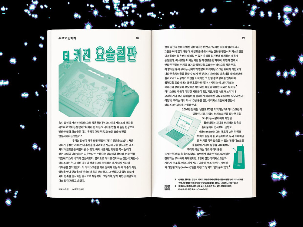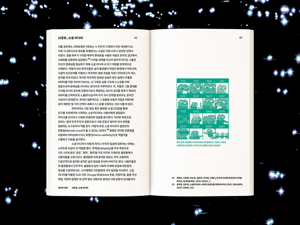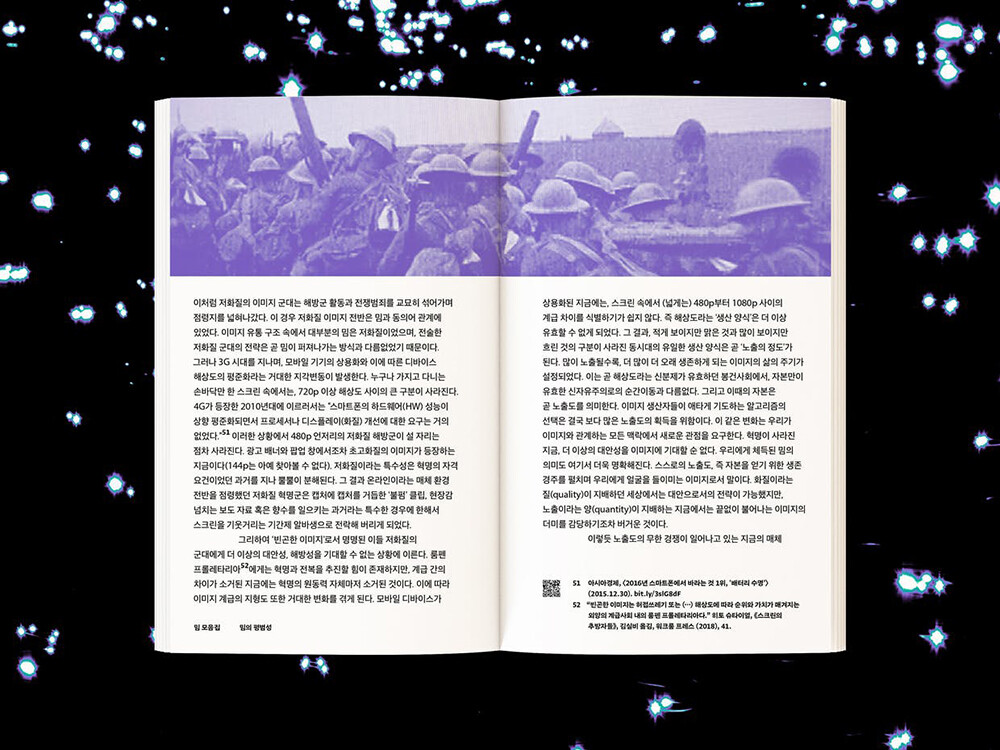 답사 보고서와 작가 노트, 혹은 (이미지의 우주 속)여행 수필의 중간에 위치한 <i의mage>는 “우리가 스크린 속에서 이미지/데이터를 바라보는 ‘모든’ 방식”에 대하여 묘사하고 있다. 포스트 인터넷 시대마저 지난 지금, 디지털 매체 환경을 묘사하는 무수히 많은 시도가 이어져 왔다. 그러나 피부와 검은 유리 화면 사이의 내밀한 호흡에 보다 초점을 맞춘 6편의 토막글은, 미시적인 차원에서 스크린을 방황하는 우리 모두의 문제의식과 쉽게 맞닿을 수 있으리라 기대한다.