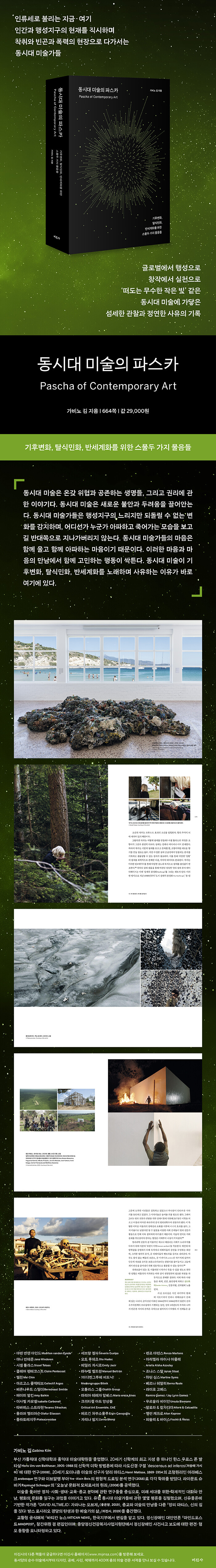 이 책 『동시대 미술의 파스카』는 인류세로 불리는 지금 여기의 행성지구, 그리고 인간을 비롯한 지구 생명의 현존 방식에 문제의식을 둔 동시대의 미술을 다룬다. 착취와 빈곤, 폭력이 만연한 오늘의 세계에서 미술과 미술가는 무엇을 하고 있으며 또 무엇을 할 수 있는가. 이 책에선 미술이 지상과 괴리된 순수한 영역의 무언가가 아니라 인간 삶의 다양한 양상, 인간을 감싸 안은 지구의 생태와 필연적으로 연결되어 있다는 점을 분명히 한다. 이 책의 저자는 인류세라는 새로운 말을 기꺼이 공유하면서도 그 섬광에 갇히지 않고, 고통의 현장에 다가가서 외면당한 자/것들의 목소리에 귀 기울이는, “떠도는 무수한 작은 빛(lucciole)”(조르주 디디 위베르만)과 같은 미술실천들에 집중한다. 그리고 이들의 태도와 행위를 깊이 생각하고 세심히 관찰하여 그 의미를 정연하고 이해하기 쉬운 문장으로 전한다.