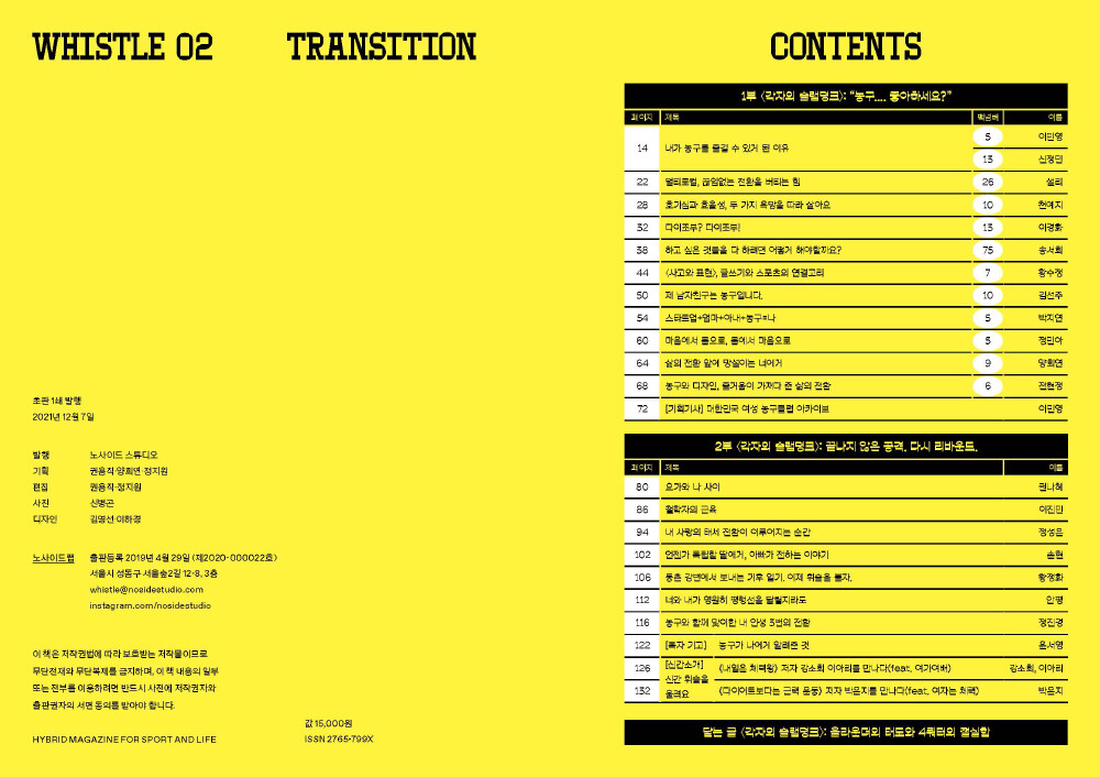 콘텐츠프로덕션 노사이드스튜디오가 일상을 스포츠의 렌즈로 바라보는 하이브리드매거진 <휘슬(Whistle)>의 2호 전환(TRANSITION)을 발행했다.