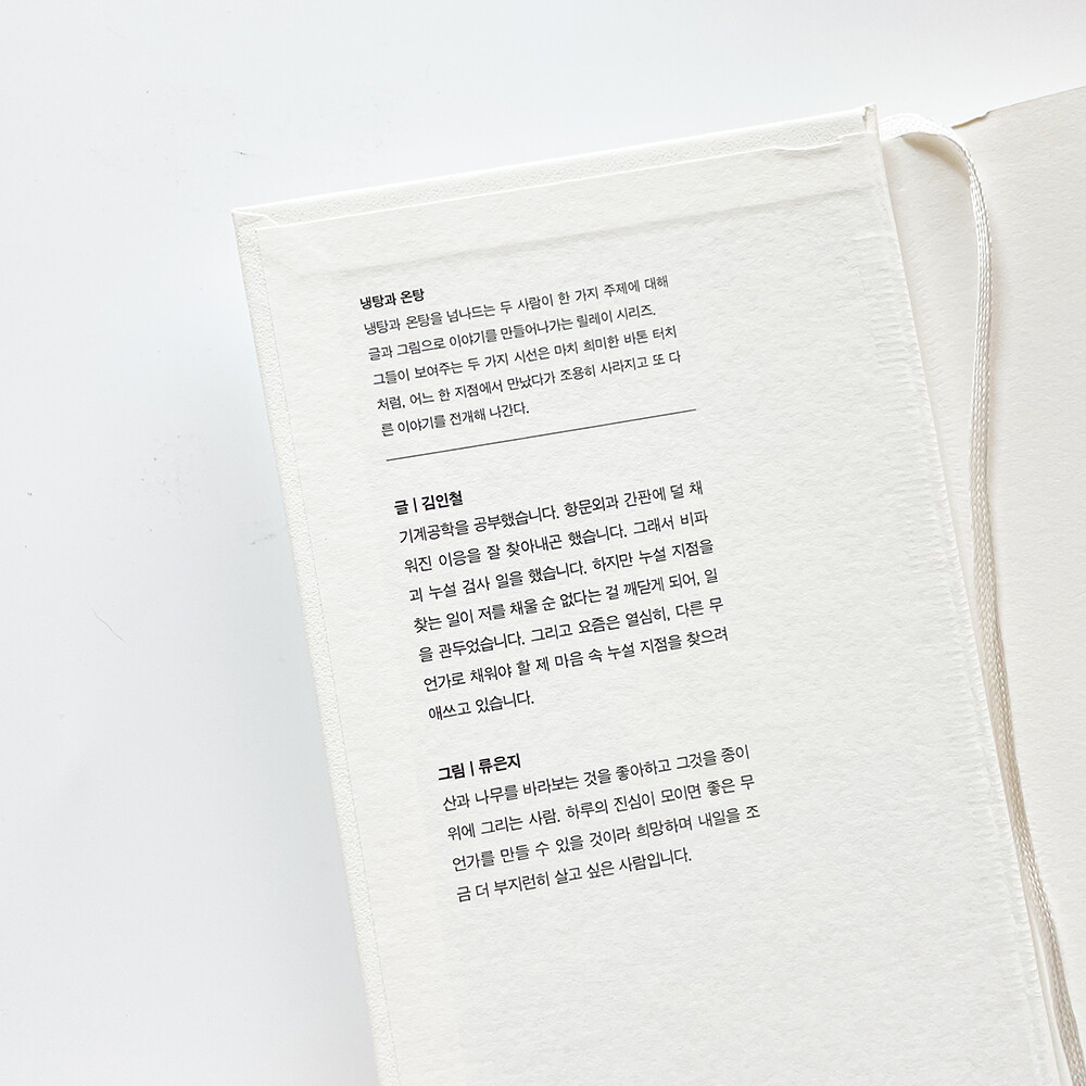 <냉탕과 온탕>시리즈는, 냉탕과 온탕을 넘나드는 두 사람이 한 가지 주제에 대해 글과 그림으로 이야기를 만들어나가는 릴레이 시리즈. 그들이 보여주는 두 가지 시선은 마치 희미한 바톤 터치처럼, 어느 한 지점에서 만났다가 조용히 사라지고 또 다른 이야기를 전개해 나간다.