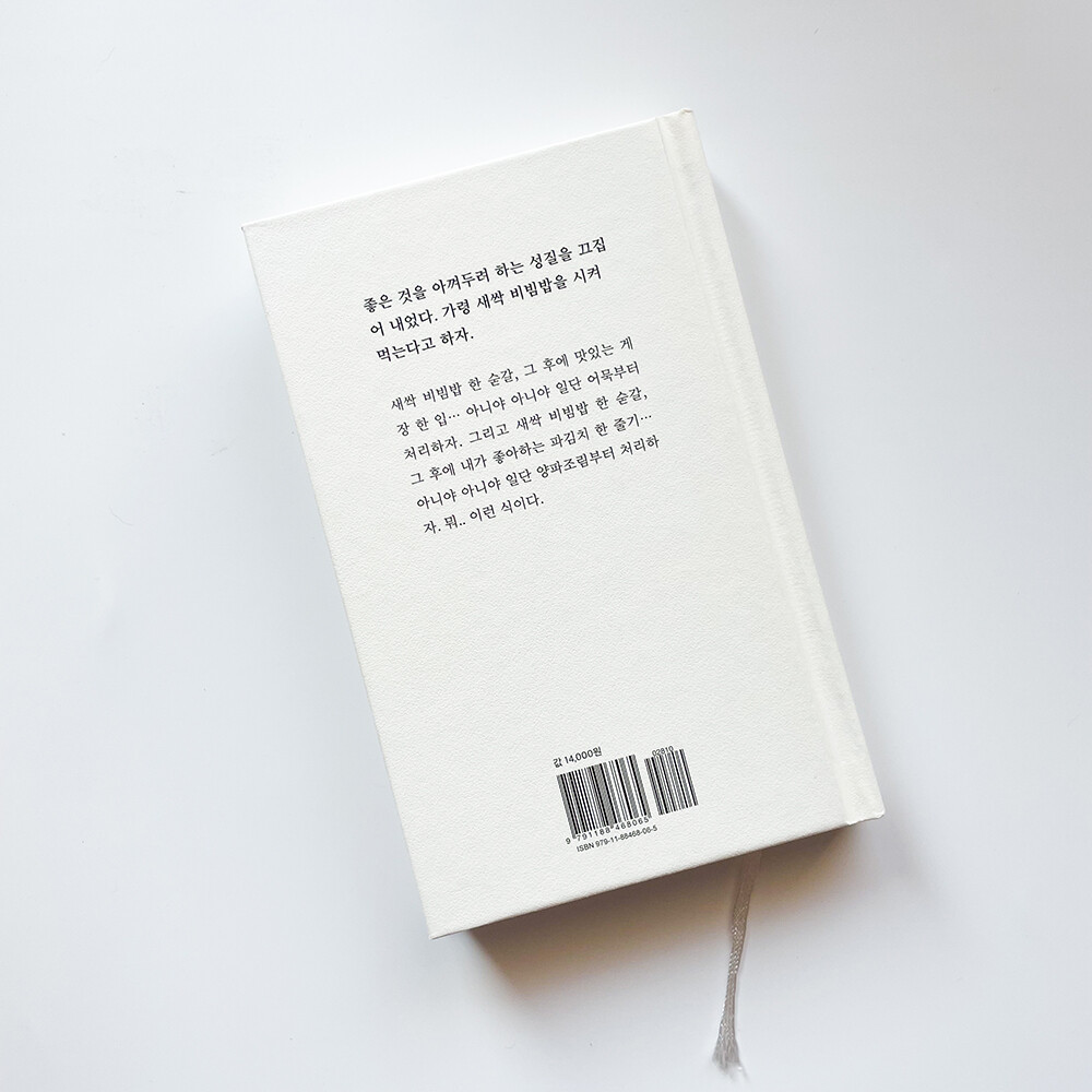 “좋은 것을 아껴두려 하는 성질을 끄집어 내었다. 가령 새싹 비빔밥을 시켜 먹는다고 하자. 새싹 비빔밥 한 숟갈, 그 후에 맛있는 게장 한 잎 ... 아니야 아니야 일단 어묵부터 처리하자. 그리고, 새싹 비빔밥 한 숟갈, 그 후에 내가 좋아하는 파김치 한 줄기 ... 아니야 아니야 일단 양파조림부터 처리하자. 뭐.. 이런 식이다.”