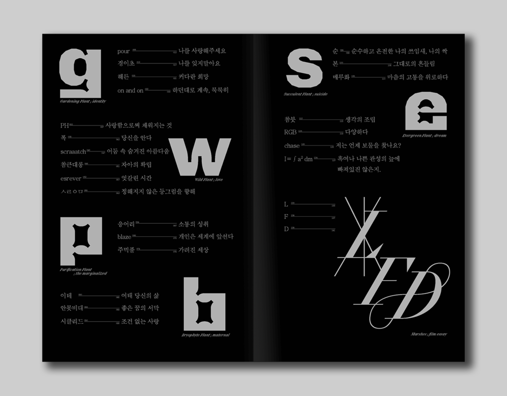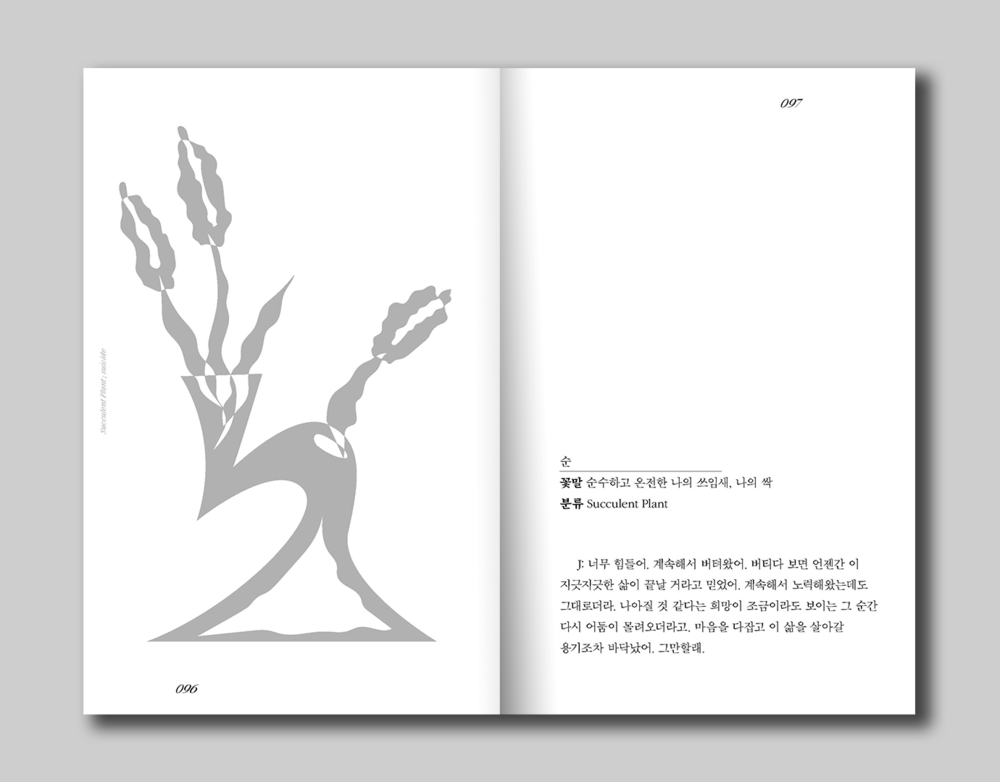 우리는 끊임없는 경쟁 속에서 나 자신을 잃었습니다. 사회에서 규정된 ‘정상성’에 도달하기 위해 재단 되고, 구겨졌습니다. 맹목적인 삶 속에서 감정은 메말라갔고, 희망은 무채색이 되었습니다. 저희는 <식물계(Plantae)>를 통해 사람들이 잊고 있던 ‘자유’를 되새기고자 합니다. 작지만 강한 감정의 이끌림을 통해 ‘나의 자유’를 발견하고, ‘타인의 자유’를 이해하고자 합니다. 이 책이 가려진 두눈을 뜨고 나와 주변을 되돌아 볼 수 있는 시간이되길 바랍니다. 각자가 꿈꾸는 이상은 다를 수 밖에 없습니다. 누군가에겐 나의 자유가 독특하고기이할 수 있죠. 하지만 괜찮아요. 그저 아름다을 뿐, 누구에게도 무해할테니까요. 각자의 품에 안은 자유의 모양대로 만들어진 26개의 식물들과 그 꽃말들로 자유 식물계를 엮어냈습니다.