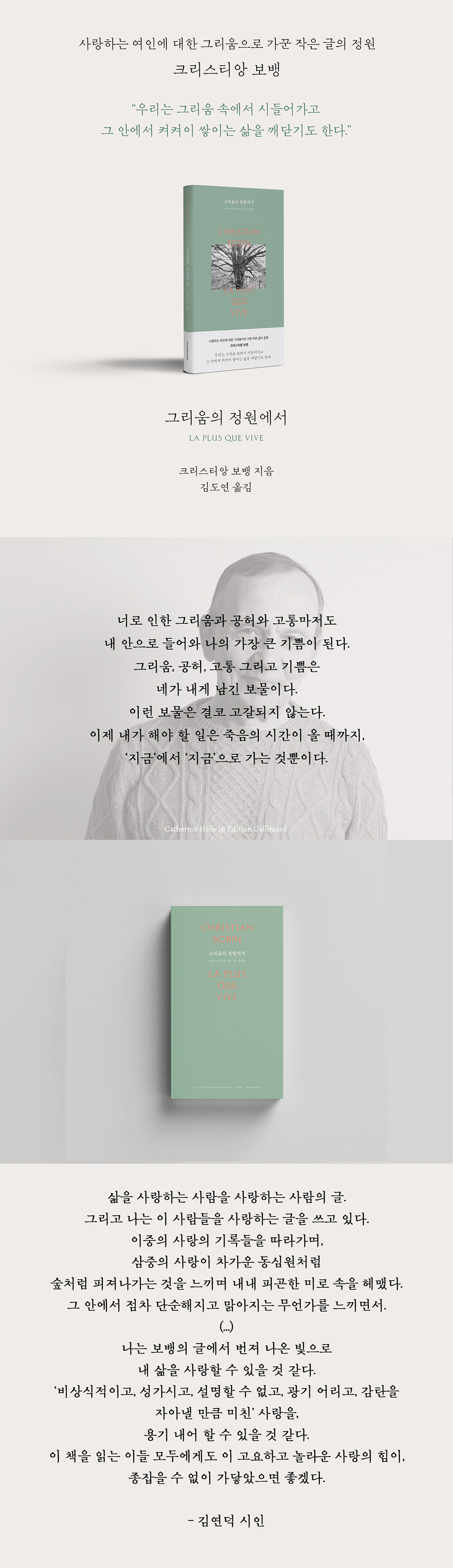 프랑스가 사랑하는 시인이자 에세이스트, 크리스티앙 보뱅이 사랑하는 여인을 잃고, 그녀에 대한 그리움으로 가꾼 작은 글의 정원 『그리움의 정원에서』가 1984Books에서 출간되었다. 그녀의 이름은 ‘지슬렌 마리옹’, 1979년 가을에 처음 만나, 그로부터 줄곧 그가 가장 바쁘고도 고요한 방식으로 사랑한 여인. 1995년 여름 파열성 뇌동맥류로 세상을 떠나고, 같은 해 가을과 겨울, 크리스티앙 보뱅은 형언할 수 없는 상실감을 넘어서 그만의 섬세하고 부드러운 목소리로 여전히 생생한 그녀의 모습을 이 책 속에 담았다.