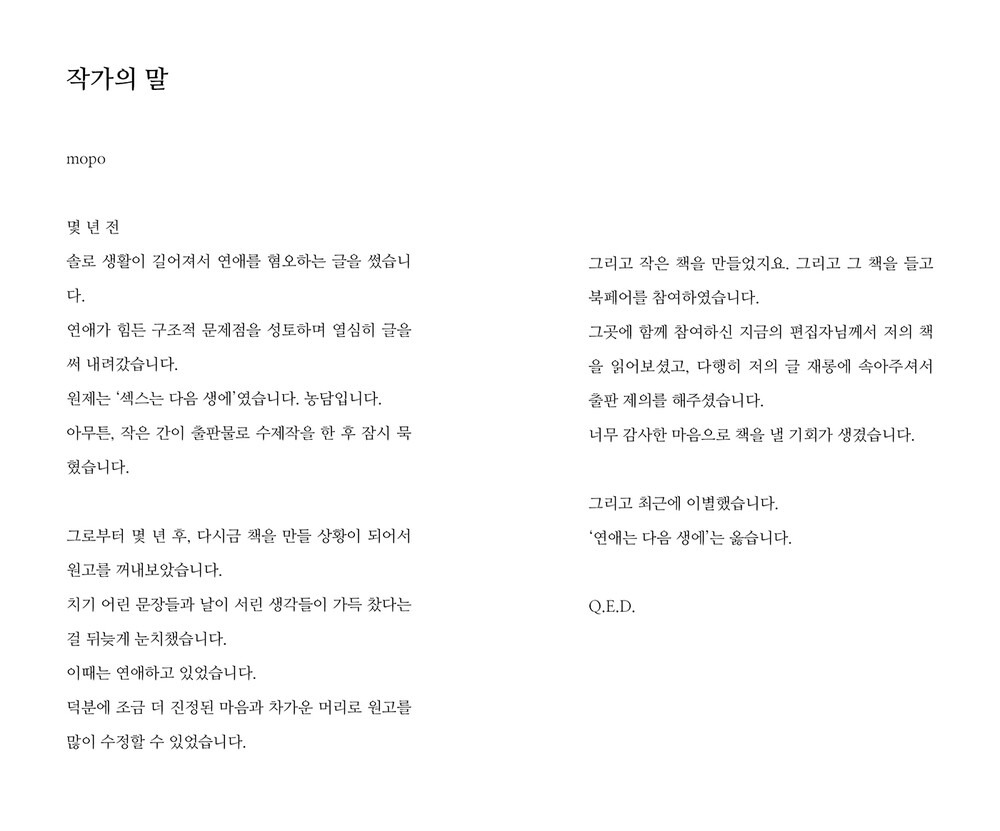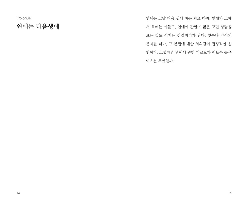 연애를 이야기하려면 먼저 범위부터 정해야 한다. 어디부터 어디까지가 연애다. 저자는 '연인 사이에서 벌어지는 더럽고 추악한 모든 면모'를 빼놓고는 연애를 이야기할 수 없다고 분명히 한다. 연애란 무엇인가. 우리는 어떤 연애를 하고 있고, 어떤 연애를 해야 하는가. 제목처럼 연애는 다음 생에야 가능한 일인지, 아니면 연애 못하는 작가가 그냥 울면서 쓴 글인지 확인하려면 책을 읽을 수밖에 없다. 작고 얇은 책이라 잠깐이면 읽는다. 낄낄 대며 읽고 난 후의 여운은 생각보다 오래 간다.