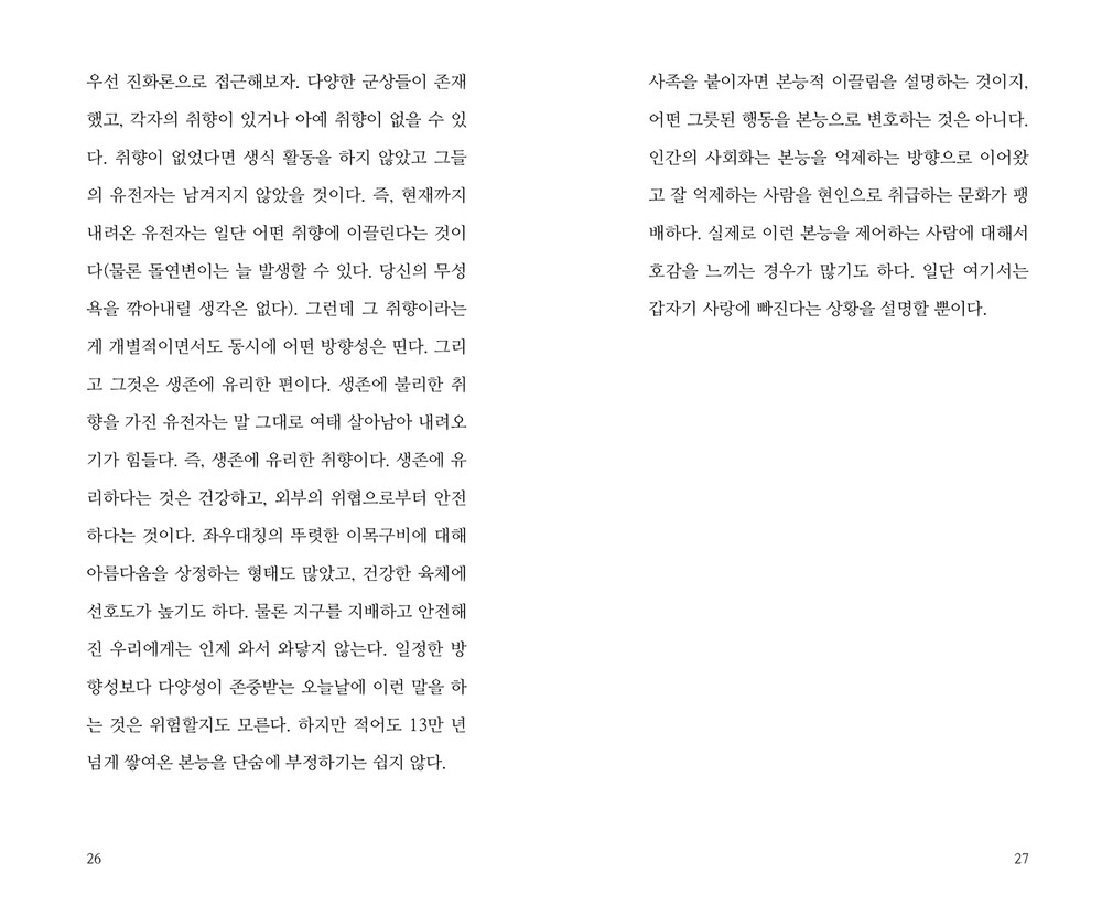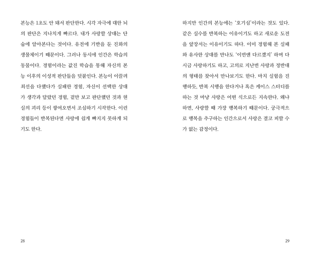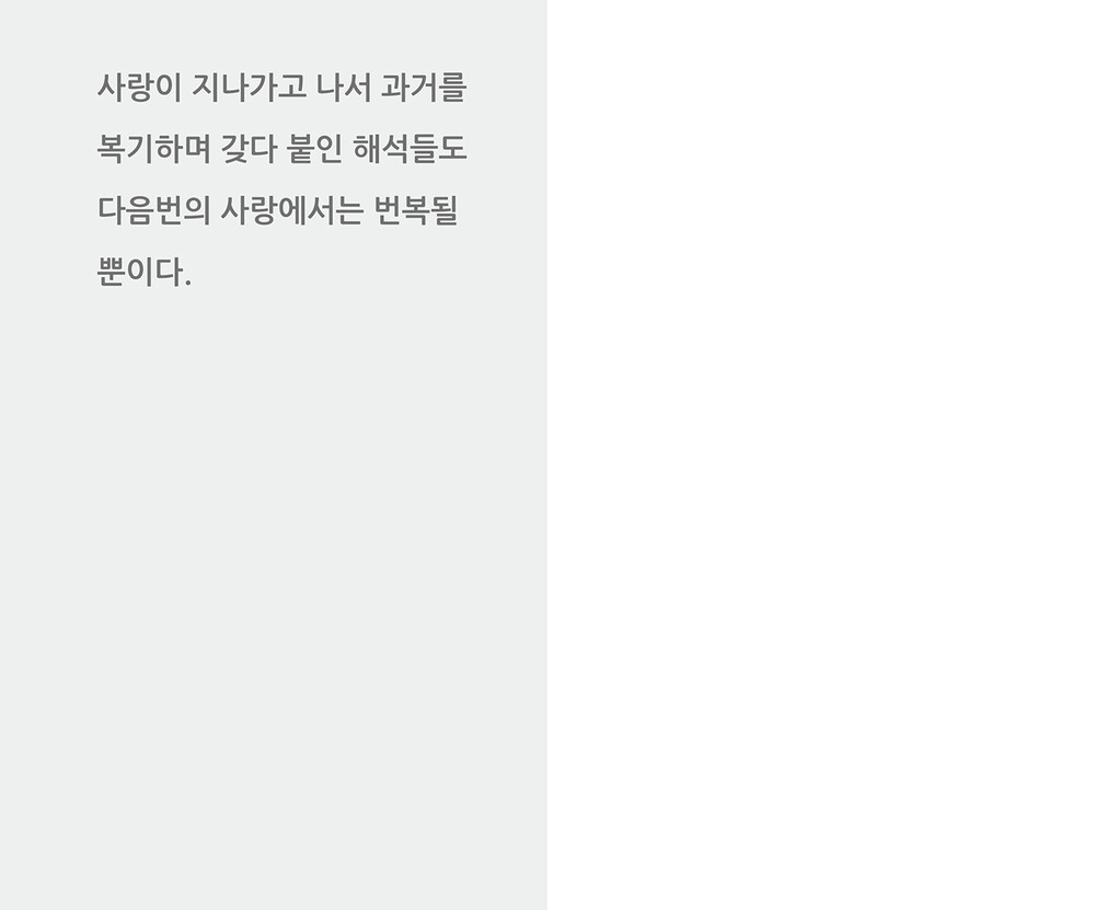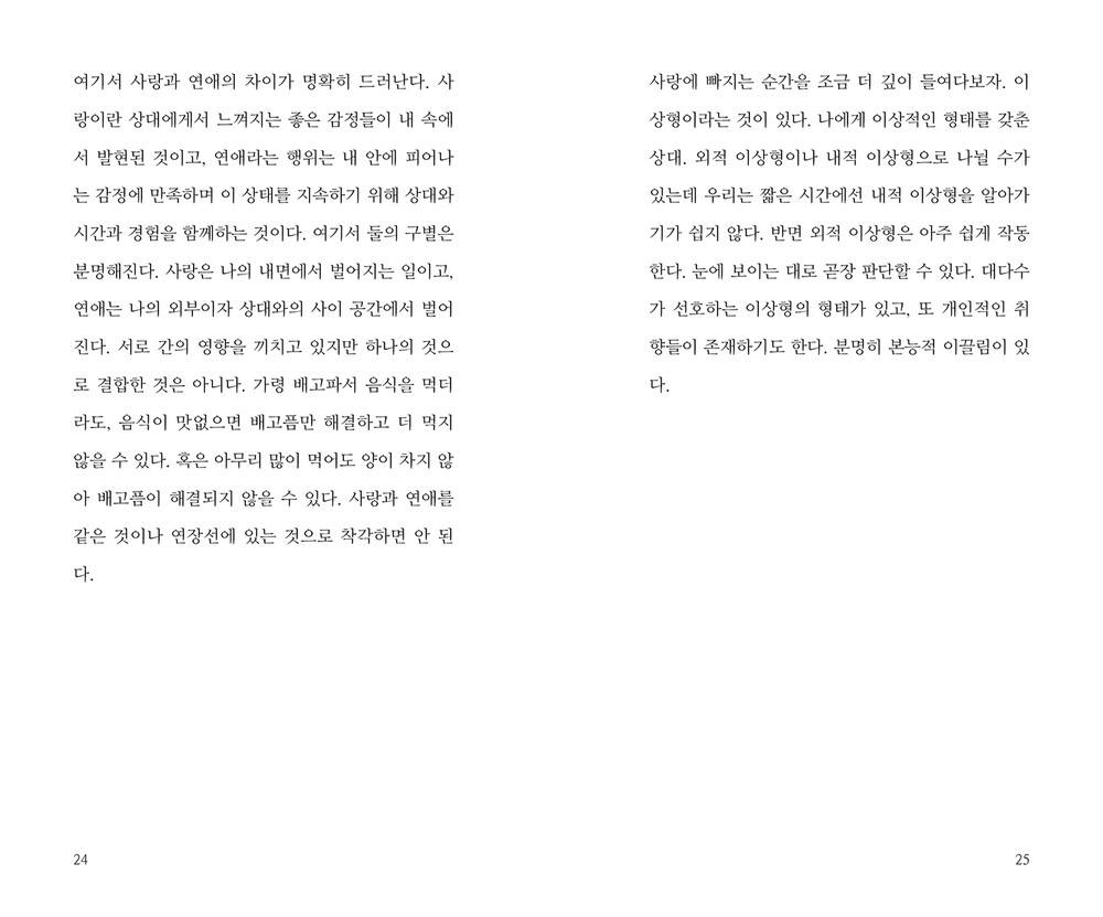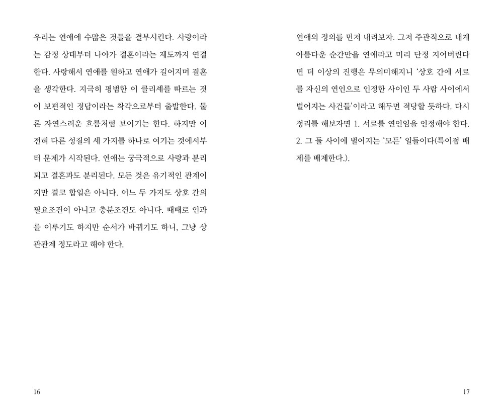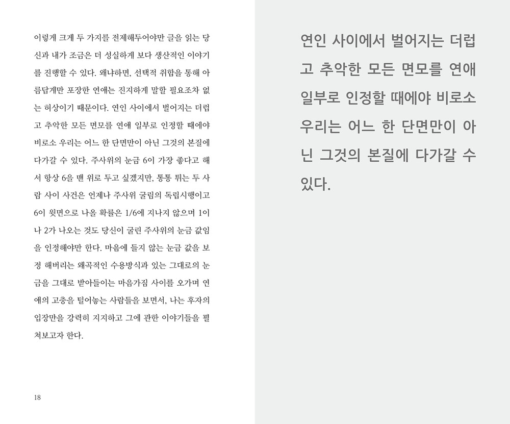 이렇게 크게 두 가지를 전제해두어야만 글을 읽는 당신과 내가 조금은 더 성실하게 보다 생산적인 이야기를 진행할 수 있다. 왜냐하면, 선택적 취합을 통해 아름답게만 포장한 연애는 진지하게 말할 필요조차 없는 허상이기 때문이다. 연인 사이에서 벌어지는 더럽고 추악한 모든 면모를 연애 일부로 인정할 때에야 비로소 우리는 어느 한 단면만이 아닌 그것의 본질에 다가갈 수있다. 주사위의 눈금 6이 가장 좋다고 해서 항상 6을 맨 위로두고 싶겠지만, 통통 튀는 두 사람 사이 사건은 언제나 주사위굴림의 독립시행이고 6이 윗면으로 나올 확률은 1/6에 지나지않으며 1이나 2가 나오는 것도 당신이 굴린 주사위의 눈금 값임을 인정해야만 한다. 18사랑이 지나가고 나서 과거를 복기하며 갖다 붙인 해석들도 다음번의 사랑에서는 번복될 뿐이다. 우리 생애를 다 지나고 나서도 사랑이 뭔지 알 수 없을 듯하다.