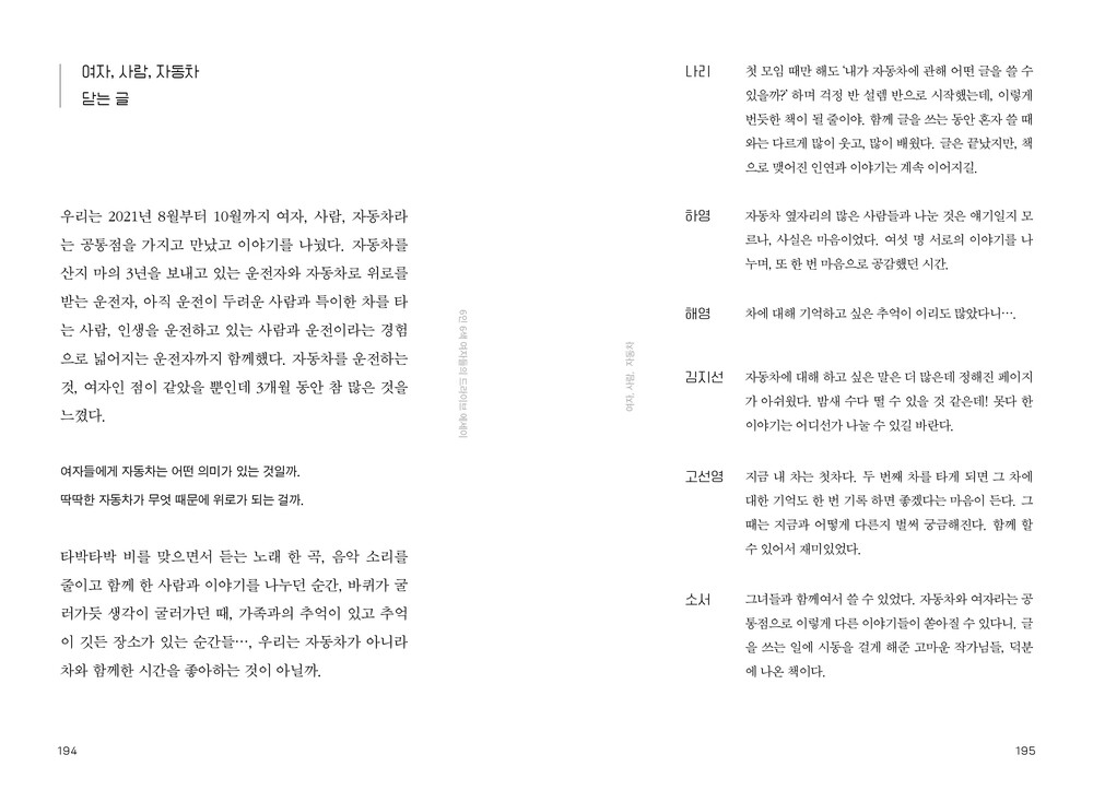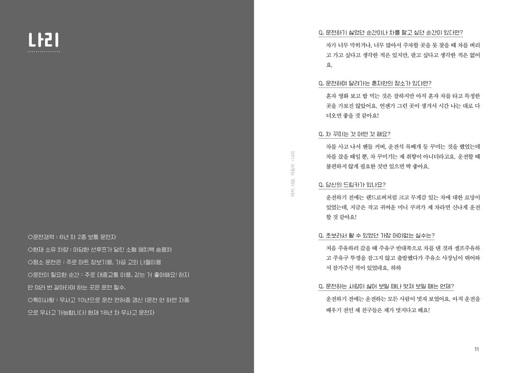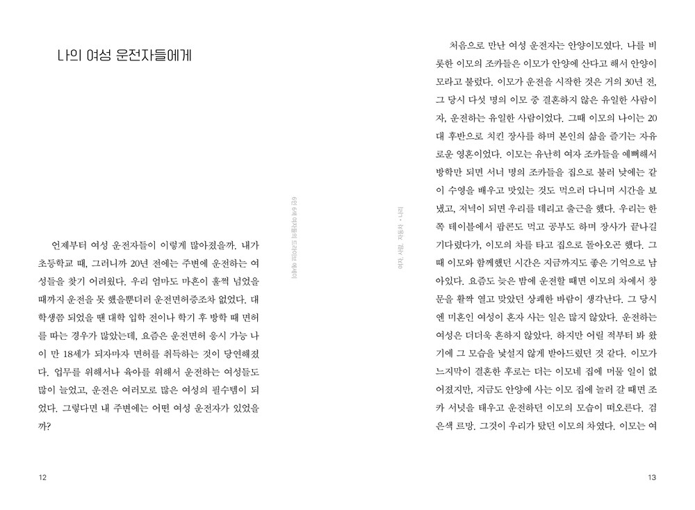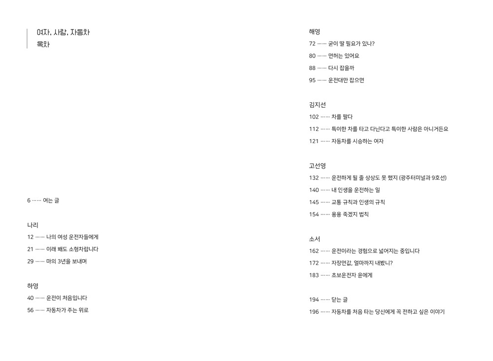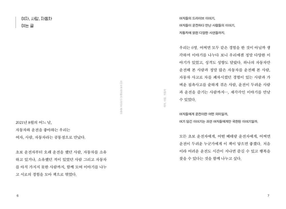 자동차를 운전하고, 드라이브를 좋아하고, 차 안에서 머문 시간과 그 속에서 펼쳐진 순간들을 사랑하는 6명의 이야기. 초보운전자부터 오래 운전을 했던 사람, 자동차를 소유하고 있거나, 소유했던 적이 있었던 사람 그리고 아직 소유하지 못한 사람까지, 함께 모여 이야기를 나누고 서로의 경험을 모아 책으로 엮었다. 모든 초보운전자에게, 어떤 베테랑 운전자에게, 어쩌면 운전이 두려운 누군가에게 이 책을 전한다. 당신의 생각과 우리의 이야기가 닿아 머물길 바라며, 어느 도로 위에서 스쳐 지나가는 운전자이길 바란다.