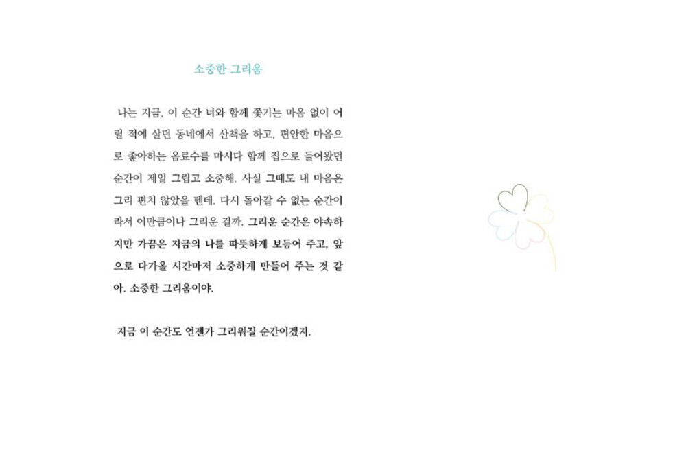 더하여 ‘시간, 나와 너 그리고 사랑’ 누구나 공감할 수 있을 이야기로 이루어져 있습니다.